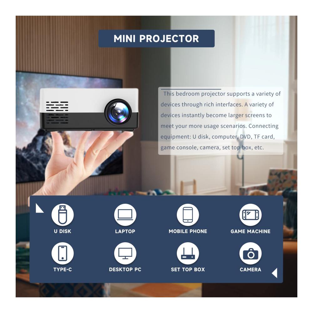 UNTERSTÜTZTE GERÄTE: Dieser Schlafzimmerprojektor unterstützt eine Vielzahl von Geräten über umfangreiche Schnittstellen. Eine Vielzahl von Geräten werden sofort zu größeren Bildschirmen, um Ihren mehr Nutzungsszenarien gerecht zu werden. Anschließen von Geräten: U-Disk, Computer, DVD, TF-Karte, Spielekonsole, Kamera, Set-Top-Box usw.