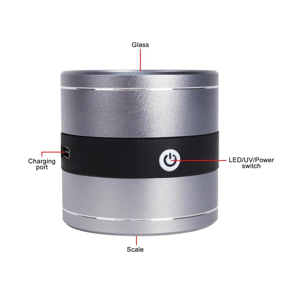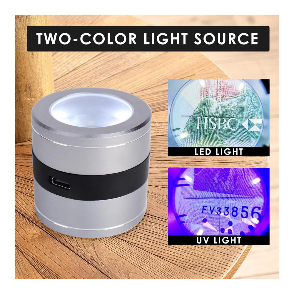 • UV-Licht erhöht die Funktionalität der Lupe noch weiter, indem es für ultraviolette Beleuchtung sorgt. Diese Funktion erweist sich als besonders wertvoll für Aufgaben, bei denen die Identifizierung von Materialien erforderlich ist, die unter UV-Licht fluoreszieren.