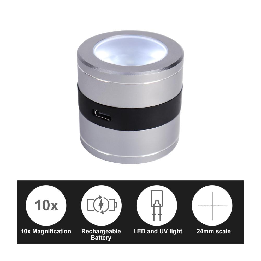 Diese hochwertige 10X Juwelierlupe mit LED- und UV-Licht sowie metrischer Skala und USB-LED-Ladeanzeige ist ein unverzichtbares Werkzeug für Schmuckliebhaber und Sammler von Edelsteinen, Briefmarken und Münzen. Entwickelt für Benutzerfreundlichkeit, bietet sie eine unkomplizierte Bedienung für Anfänger und Profis gleichermaßen. Hergestellt aus einer Kombination aus Aluminiumlegierung und optischer Glaslinse, garantiert sie eine herausragende Haltbarkeit, selbst bei langfristigem Gebrauch.