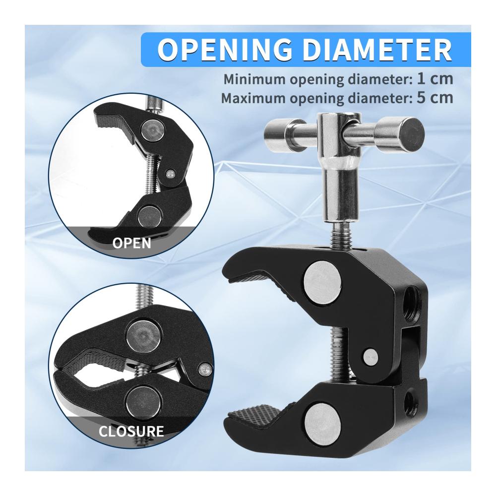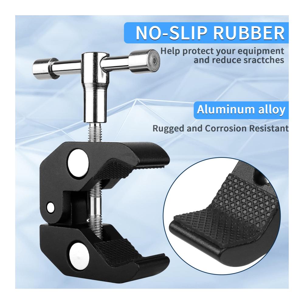 【Super Clamp】Die Superklemme lässt sich in mehreren Größenbereichen verstellen, ist einfach zu montieren und eignet sich zur Befestigung an Halterungen oder anderen Produkten.Die Studioklemm wird mit dem magischen Arm verwendet, um Ihnen mehr Szenenaufnahmen zu ermöglichen, und ist Ihr Assistent für die rechte Hand zum Erstellen von Videos und Aufnahmen.