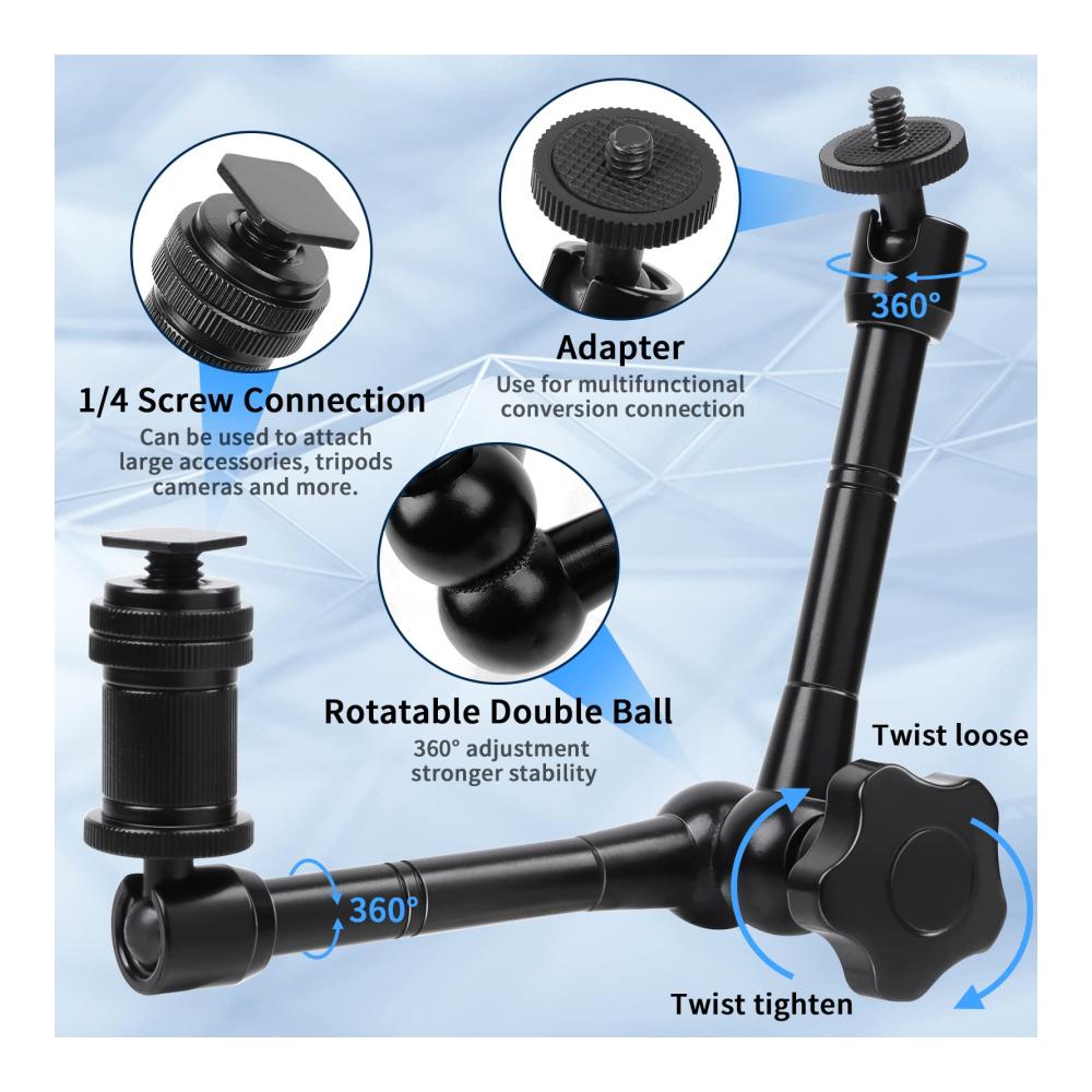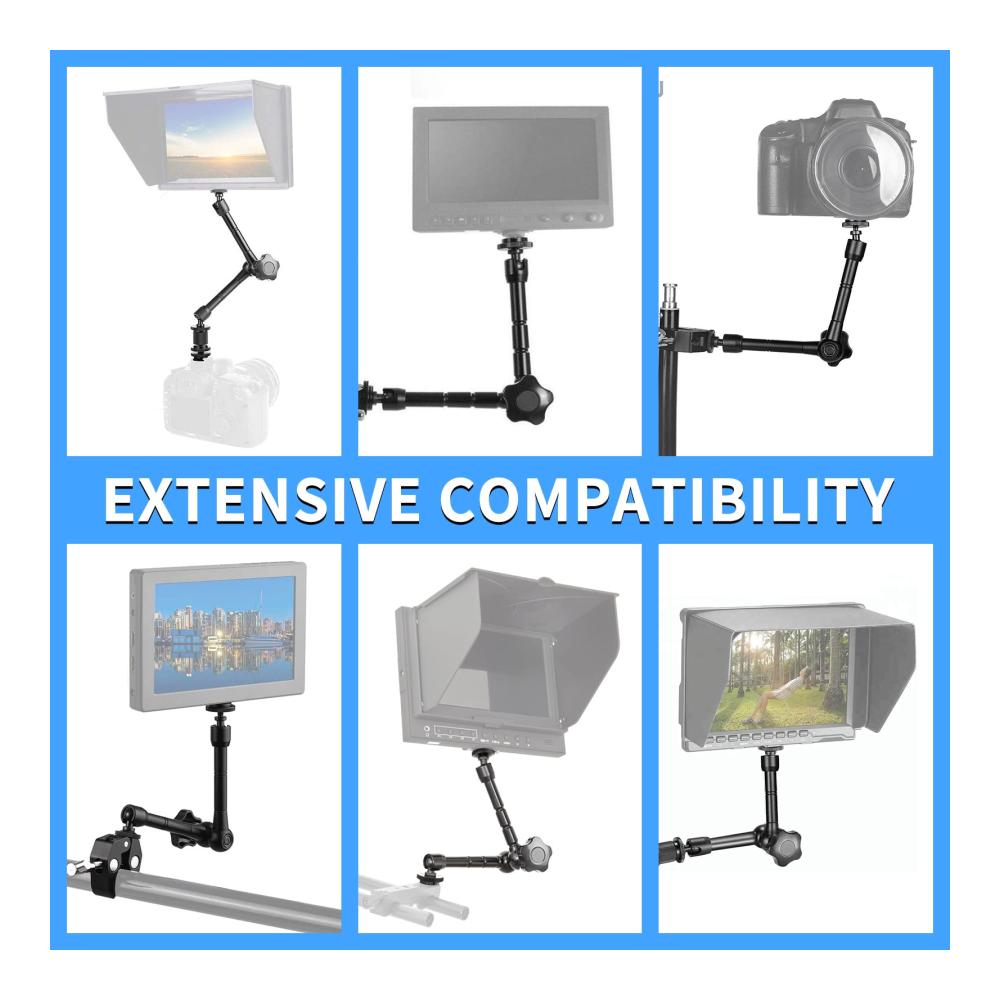 【Stabile und Robuste】Der 11 Zoll Magic Arm hergestellt aus hochfestem Aluminiumlegierungsmaterial, mit einem stabilen Verriegelungskontrollknopf, um die Sicherheit und stabile Aufnahme Ihrer Ausrüstung zu gewährleisten, der schnell gesperrt und für eine einfache Einstellung während des Schießens freigegeben werden kann.