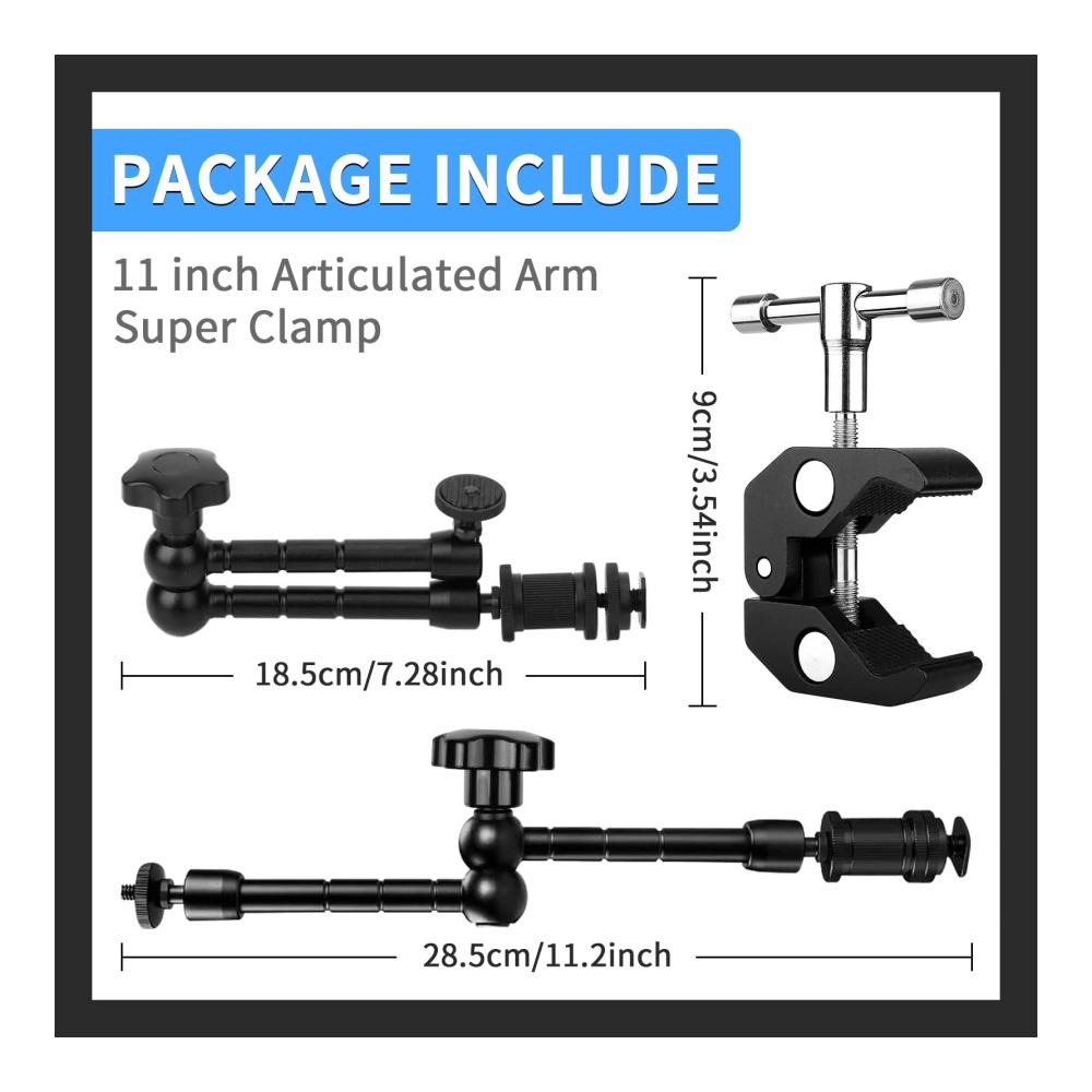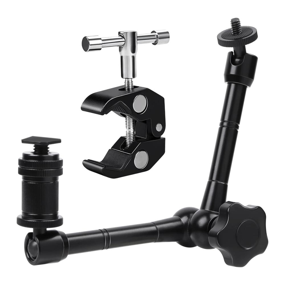Entdecken Sie den 11 Zoll Verstellbaren Magic Arm und die Große Super Clamp mit 1/4 und 3/8 Schraubenlöchern. Dieser Gelenkarm und diese Klammer sind perfekt für Ihre Ausrüstung und bieten vielseitige Möglichkeiten zur Montage von Kamera, Camcorder, Handy und mehr. Mit einem 360-Grad-drehbaren Kopf können Sie Ihre Geräte in jeden gewünschten Winkel ausrichten. Aus hochwertigem Aluminiumlegierungsmaterial gefertigt, bieten sie Stabilität und Festigkeit. Ideal für LED-Lichter, LCD-Monitore und Blitzlicht. Geeignet für die Verwendung mit Action Cams, Smartphones und leichten Kameras. Erleichtern Sie Ihr Fotografie- und Videoerlebnis mit diesen hochwertigen Schnellkupplungen & -platten.