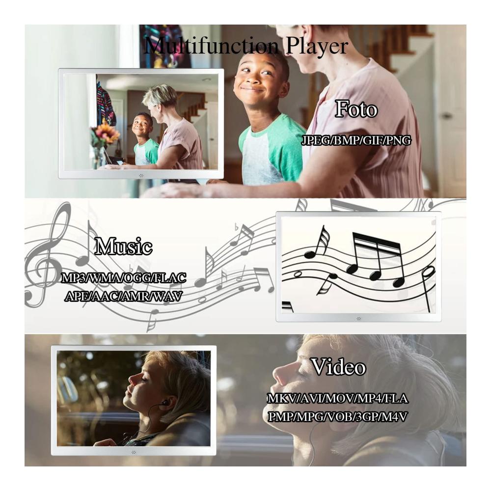 【Multifunktionaler Fotorahmen】Mit diesem digitalen Fotorahmen können Sie nicht nur Bilder und Videos hochladen und ansehen, sondern auch Alarme, Uhrzeit und Datum, automatisches Ein- und Ausschalten, Bildzoom und mehr einstellen. Es unterstützt auch die Anzeige von Bildern mit Hintergrundmusik und vieles mehr. Es stehen sogar 6 Sprachen zur Auswahl. Ein digitaler Fotorahmen, der alle Ihre Anforderungen erfüllt.