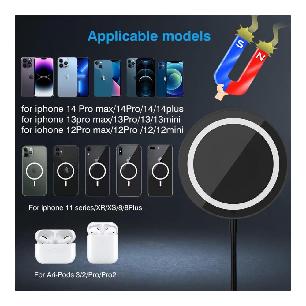WIDE COMPATIBILITY-15W Slim magnetische Sicherheit Ladegerät ist kompatibel mit iPhone 15/14/13 und /2/Pro und andere drahtlose Geräte aufladen, kann das Ladegerät perfekt auf das Telefon angebracht werden und starten Sie den Ladevorgang, Plug and Play.