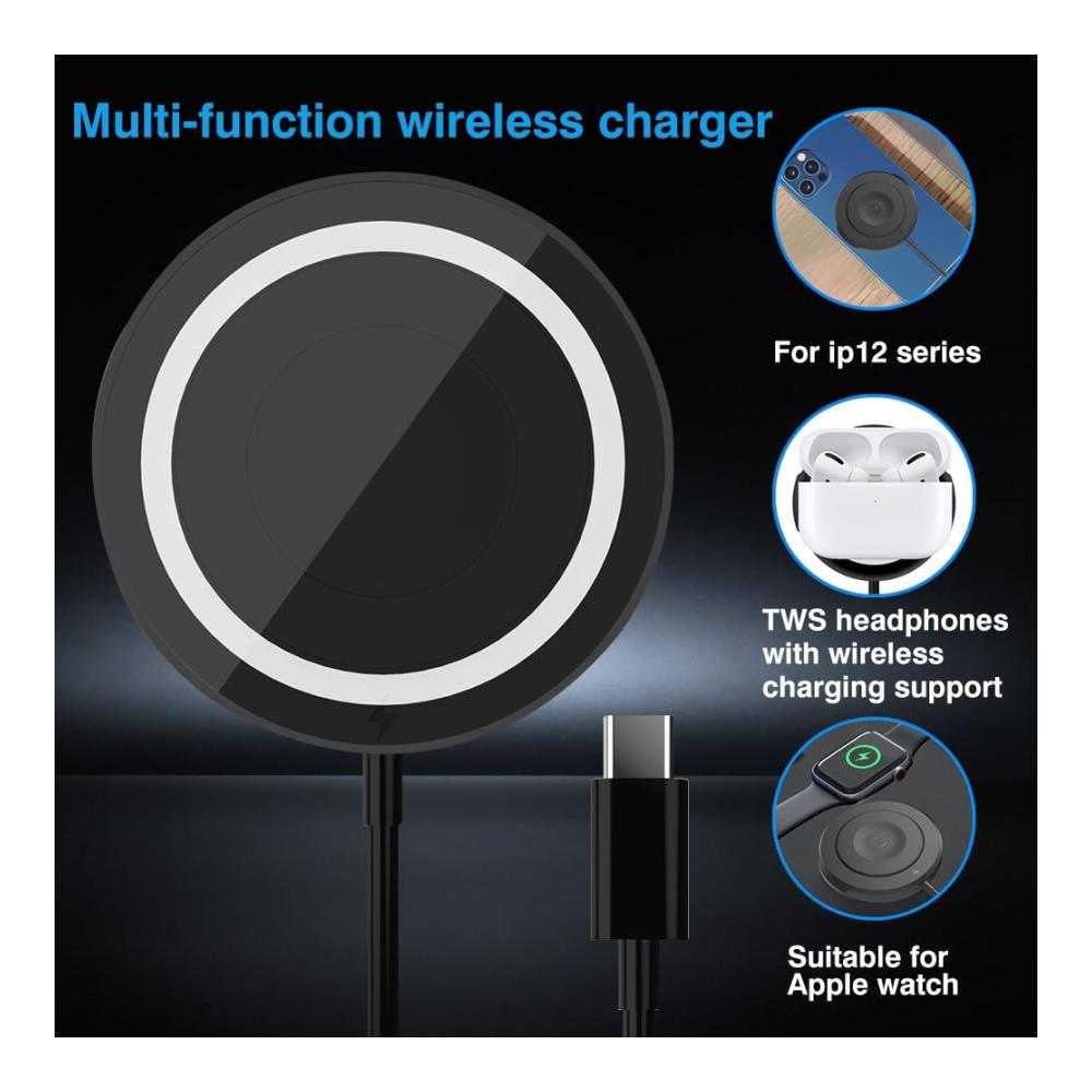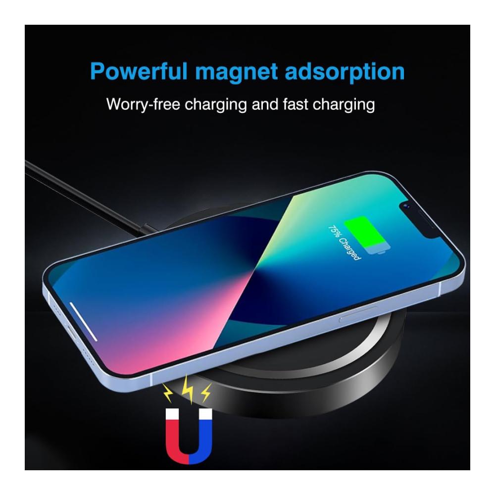 Erleben Sie das 15W Ultra Slim Ladegerät für Mag-Safe, eine magnetische Ladestation mit USB-C Adapter, die induktives kabelloses Laden ermöglicht. Kompatibel mit iPhone 15/14/13/12/Pro/Max und anderen drahtlosen Geräten.