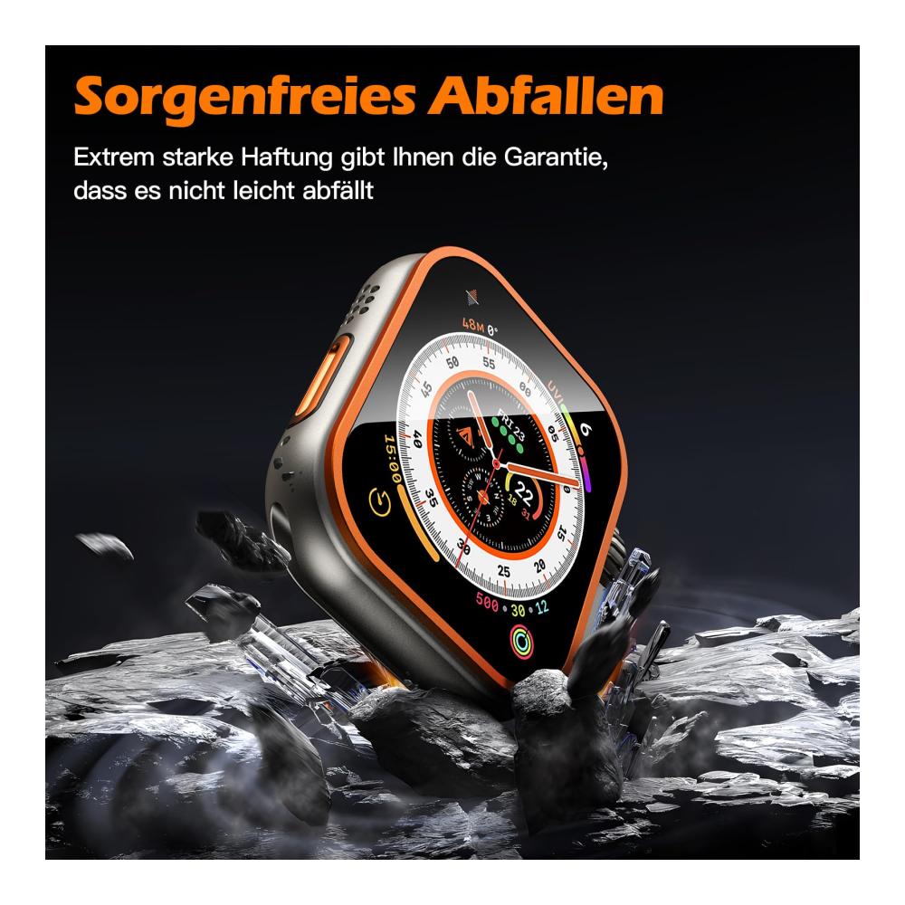 【Fällt Nicht Leicht ab & Wasserdicht】Der displayschutz haftet stärker und fällt nicht leicht ab. Er passt sich eng an die iWatch Ultra 2/ Ultra an und verhindert effektiv, dass die Apple Watch herunterfällt oder wackelt. Zusätzlich ist die uhrenabdeckung ausgezeichnet wasserdicht.
