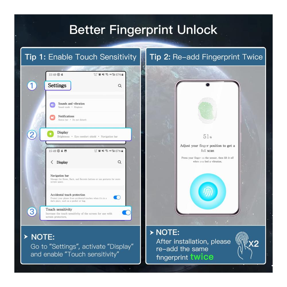 [Fingerabdruck Entsperrt] Entwickelt für Samsung Galaxy S23 / S23 Plus 5G 6,6 Zoll. Für ein besseres Entsperrerlebnis gehen Sie bitte zu den Einstellungen Ihres Geräts, um die Berührungsempfindlichkeit zu aktivieren, und geben Sie nach dem Anbringen der Folie Ihren Fingerabdruck erneut ein