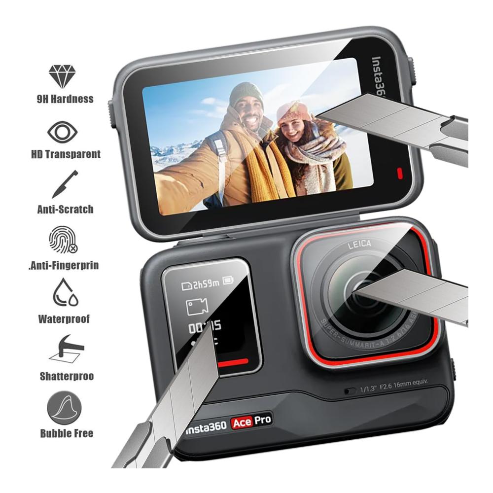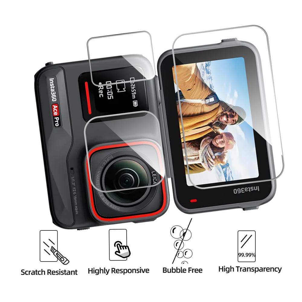 Die Schutzfolie für Insta360 ACE Pro bietet erstklassigen Schutz für Ihr Gerät. Mit einer Härte von 9H und einer Reinheit von 0.99 bewahrt sie die makellose Klarheit Ihres Displays und Objektivs. Kompatibel mit Insta360 ACE Pro Kameras.