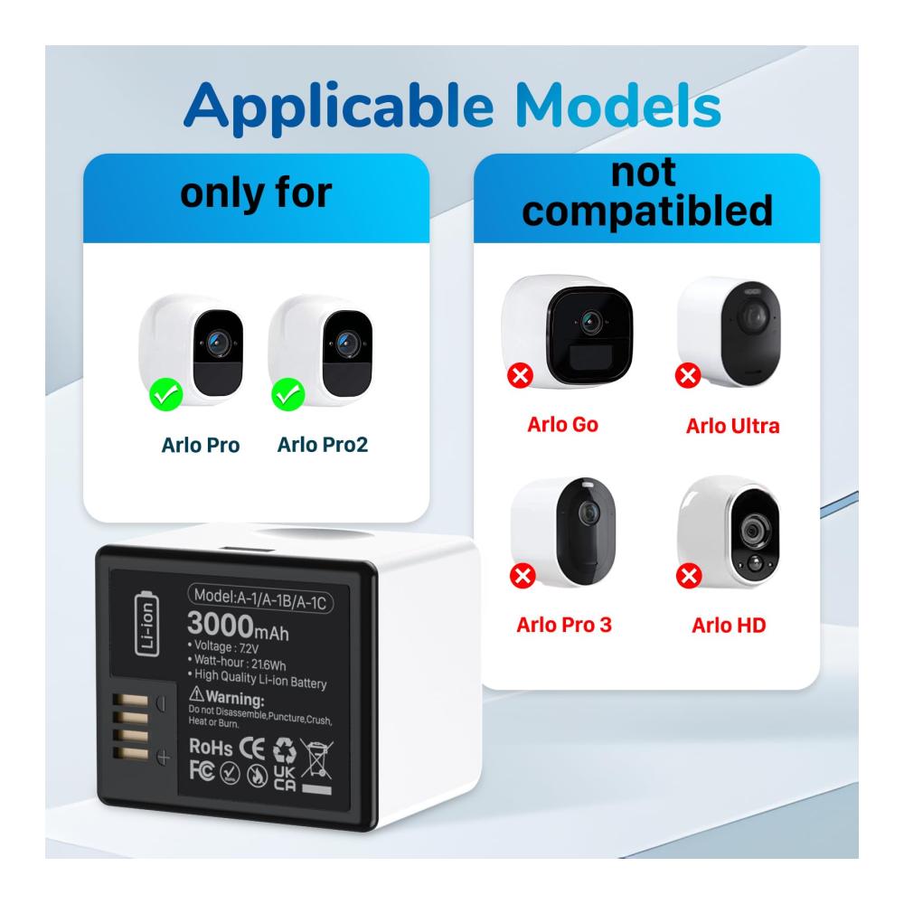 Ersetzen Sie Ihre Arlo Pro/Pro 2 Kameras mit diesem 2er-Pack Lithium-Ionen-Akkus für eine ähnlich hohe Speicherkapazität. Kompatibel mit verschiedenen Modellen und einfach zu installieren. Perfekte Ersatzbatterien für längere Betriebszeiten.