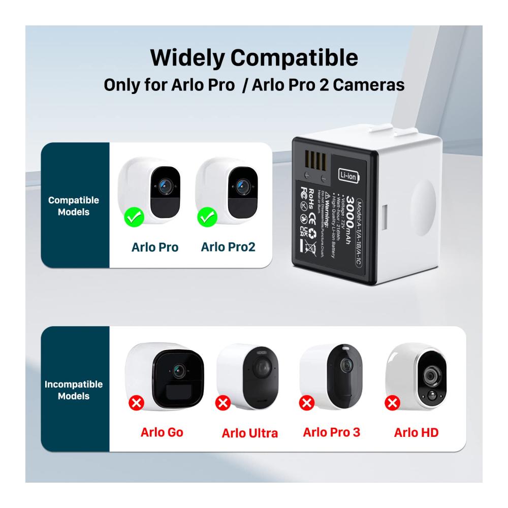 LCLEBM 3000mAh Ersatzakku für Arlo Pro/ Arlo Pro 2 wiederaufladbare Sicherheitskamera – 1 Packung– Lange Standby-Zeit – A-1 wiederaufladbare Batterie mit neuen aktualisierten 3000mAh hohe Kapazität, die lange gehalten werden kann, treibt Ihr Gerät für bis zu 3-6 Monate, die Lebensdauer der Batterie variiert je nach Einstellungen, Nutzung und Temperatur. In diesen unerwarteten Momenten, wenn die Batterie leer ist, ist es wichtig, eine zusätzliche Backup-Batterie zu haben.- Mehrere Schutz- Für Arlo Pro Akku wurde von Li-Ionen-Akku-Zelle gemacht, haben strenge intelligente Erkennung Schutzfunktionen übergeben, um Kamera-Akku vermeiden Überladung, Überlastung, Überstrom, Überhitzung, Überspannung und Kurzschluss im Einsatz zu gewährleisten. Kompatibles Modell:– Für Arlo Pro / Arlo Pro 2 Kamera- Hinweis: NICHT kompatibel mit Arlo Pro 3/Pro 4, Arlo Ultra/Ultra 2, Arlo Go Camera.Achtung!1. Nicht zerlegen, zerdrücken oder löten.2. Halten Sie den Artikel von Wärmequellen oder brennbaren Orten fern.3. Laden Sie den Akku auf und lagern Sie ihn bei Raumtemperatur, halten Sie ihn von Wasser und übermäßigem Staub fern.4. Um die volle Kapazität unserer Batterie freizusetzen, empfehlen wir Ihnen, mehrere Entlade- und Ladezyklen etwa 3 Mal durchzuführen.Produkt-Spezifikation:– Kapazität: 3000mAh- Akku-Typ: Lithium-Ion- Spannung: 7.2VPaket inklusive:– 1 x 3000mAh wiederaufladbare Batterien für Arlo Pro/ Arlo Pro 2