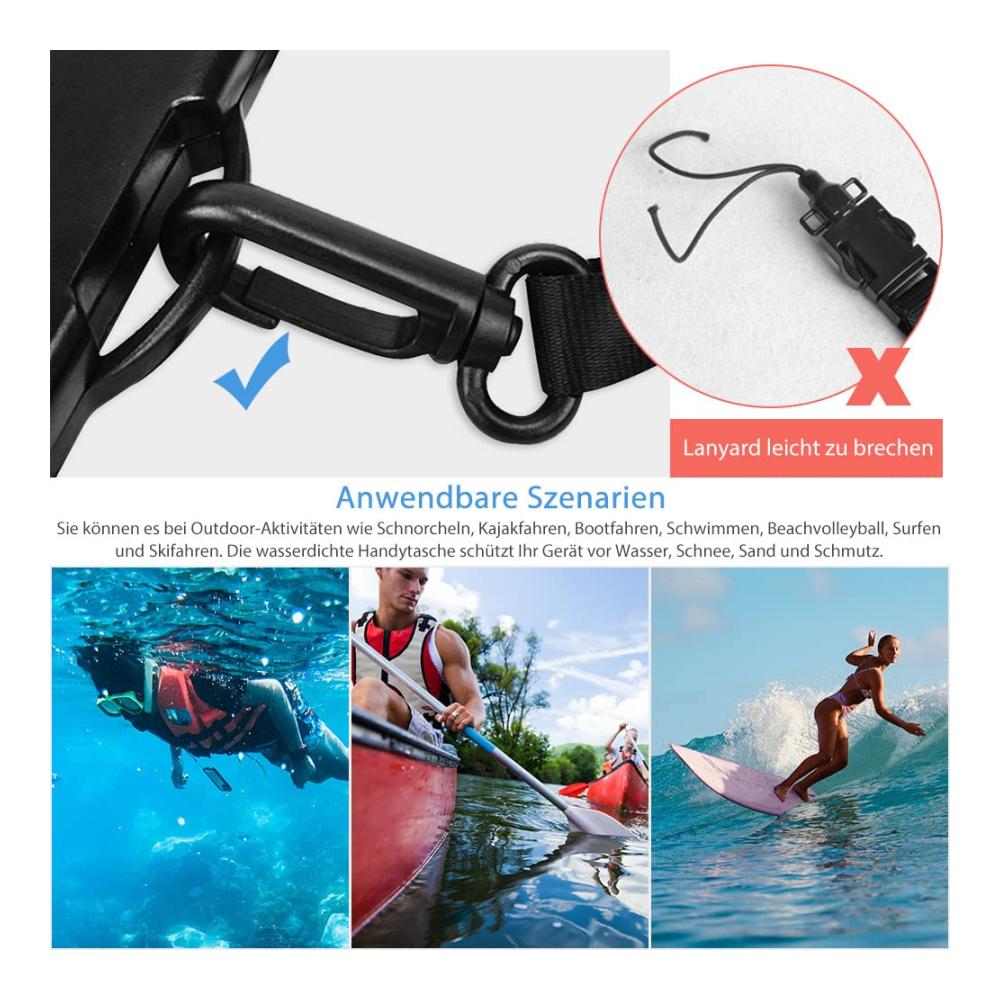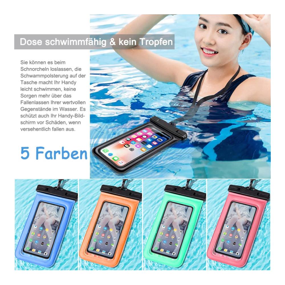 🍀Eigenschaften: ✔️ Die Luftpolsterung und das Schwammdesign auf der waterproof phone case lassen Ihr Handy leicht schwimmen, keine Sorgen mehr, Ihre wertvollen Gegenstände ins Wasser fallen zu lassen. ✔️ IPX8 zertifiziert wasserdicht mit hervorragender wasserdichter Dichtungsleistung (IPX8-Bewertung). ✔️ Top-Materialien haben einen hohen Grad an Abdichtung, können das Telefon sicher schützen und leicht öffnen und schließen die Telefonhülle. ✔️ Hochwertiges, transparentes und umweltfreundliches PVC und eine Berührungsempfindlichkeit von 99% ermöglichen es Ihnen, Ihr Mobiltelefon zu nutzen und wie gewohnt zu telefonieren. ✔️ Mega groß und kompatibel für alle Mobiltelefone oder Geräte bis zu 6,8 Zoll. ✔️ Unterwasser hülle handytasche ist eine ausgezeichnete Wahl für 5.2″ bis 6.8″ diagonale Größen Smartphones. ✔️ Geeignet für alle Arten von Outdoor-Aktivitäten am Strand, Bootfahren, Angeln, Segeln, Kanufahren, Wasser-Themenpark, Camping, Bergsteigen, Offshore-Arbeit, Regentage draußen Arbeit etc. 🍀Spezifikation Größe:19*10,5 cm Farbe: Schwarz, Rosa, Grün, Orange, Blau Material: PVC,TPU Verwendungsszenarien: Schwimmen, Bootfahren, Angeln, Segeln, Kanufahren, Wasser-Themenpark, Camping, Bergsteigen, Offshore-Arbeit, Regentage draußen Arbeit etc. 🎁 Paketinhalt: 1* Wasserdichte Handyhülle 1* Tragbares Schlüsselband 💟 Anmerkungen: 1. Bitte führen Sie vor Gebrauch einen Sicherheitstest durch. Befolgen Sie die folgenden Schritte, um ein Tuch in die wasserdichte Tasche zu stecken und es für 30-Minuten ins Wasser zu legen. Dann nehmen Sie es heraus, um zu überprüfen, ob das Gewebe nass ist. Verwenden Sie es nicht, wenn das Gewebe nass ist und lassen Sie es uns sofort wissen, um einen Ersatz zu erhalten. 2. Überprüfen Sie den Halsgurt und die Sicherheitsschnalle des wasserdichten Gehäuses nach jedem Gebrauch. 3.Es wird empfohlen, dass Sie die Hülle entfernen (wenn Ihre Hülle sehr groß ist), bevor Sie Ihr Telefon in diese wasserdichte Handytasche stecken. 4.Try starken Aufprall zu vermeiden oder scharfe Gegenstände während des Gebrauchs zu berühren. 5. Wenn die Wassertemperatur sinkt und die Telefontemperatur steigt, ist Beschlagen auf der Innenseite der Tasche der Telefontasche ein normales Phänomen. 6. Das Mobiltelefon kann unter bestimmten Wassertiefen Wasserdruck ausgesetzt sein, was den Betrieb des Touchscreens beeinträchtigt. In diesem Fall drücken Sie bitte die Lautstärketaste, um ein Bild zu machen. 7. Einfach zu Touchscreen, aber NICHT für Touch ID Fingerabdruck.