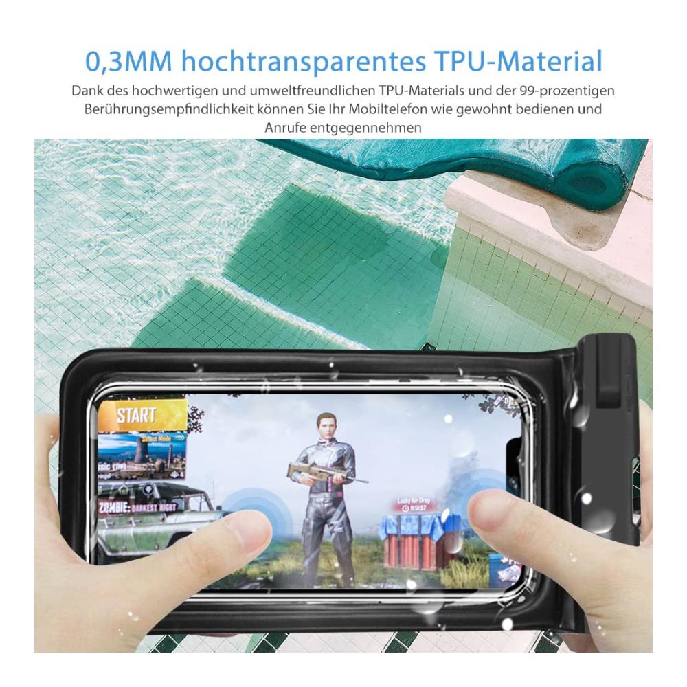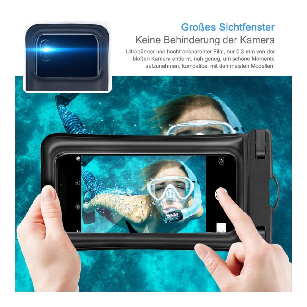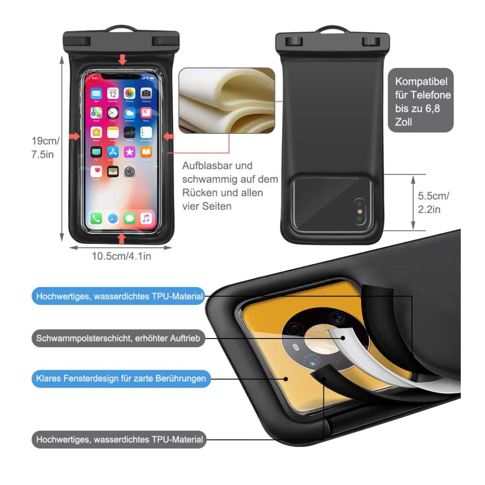 ✔️ Die Luftpolsterung und das Schwammdesign auf der waterproof phone case lassen Ihr Handy leicht schwimmen, keine Sorgen mehr, Ihre wertvollen Gegenstände ins Wasser fallen zu lassen. ✔️ IPX8 zertifiziert wasserdicht mit hervorragender wasserdichter Dichtungsleistung (IPX8-Bewertung). ✔️ Top-Materialien haben einen hohen Grad an Abdichtung, können das Telefon sicher schützen und leicht öffnen und schließen die Telefonhülle. ✔️ Hochwertiges, transparentes und umweltfreundliches PVC und eine Berührungsempfindlichkeit von 99% ermöglichen es Ihnen, Ihr Mobiltelefon zu nutzen und wie gewohnt zu telefonieren. ✔️ Mega groß und kompatibel für alle Mobiltelefone oder Geräte bis zu 6,8 Zoll. ✔️ Unterwasser hülle handytasche ist eine ausgezeichnete Wahl für 5.2 bis 6.8 diagonale Größen Smartphones. ✔️ Geeignet für alle Arten von Outdoor-Aktivitäten am Strand, Bootfahren, Angeln, Segeln, Kanufahren, Wasser-Themenpark, Camping, Bergsteigen, Offshore-Arbeit, Regentage draußen Arbeit etc.