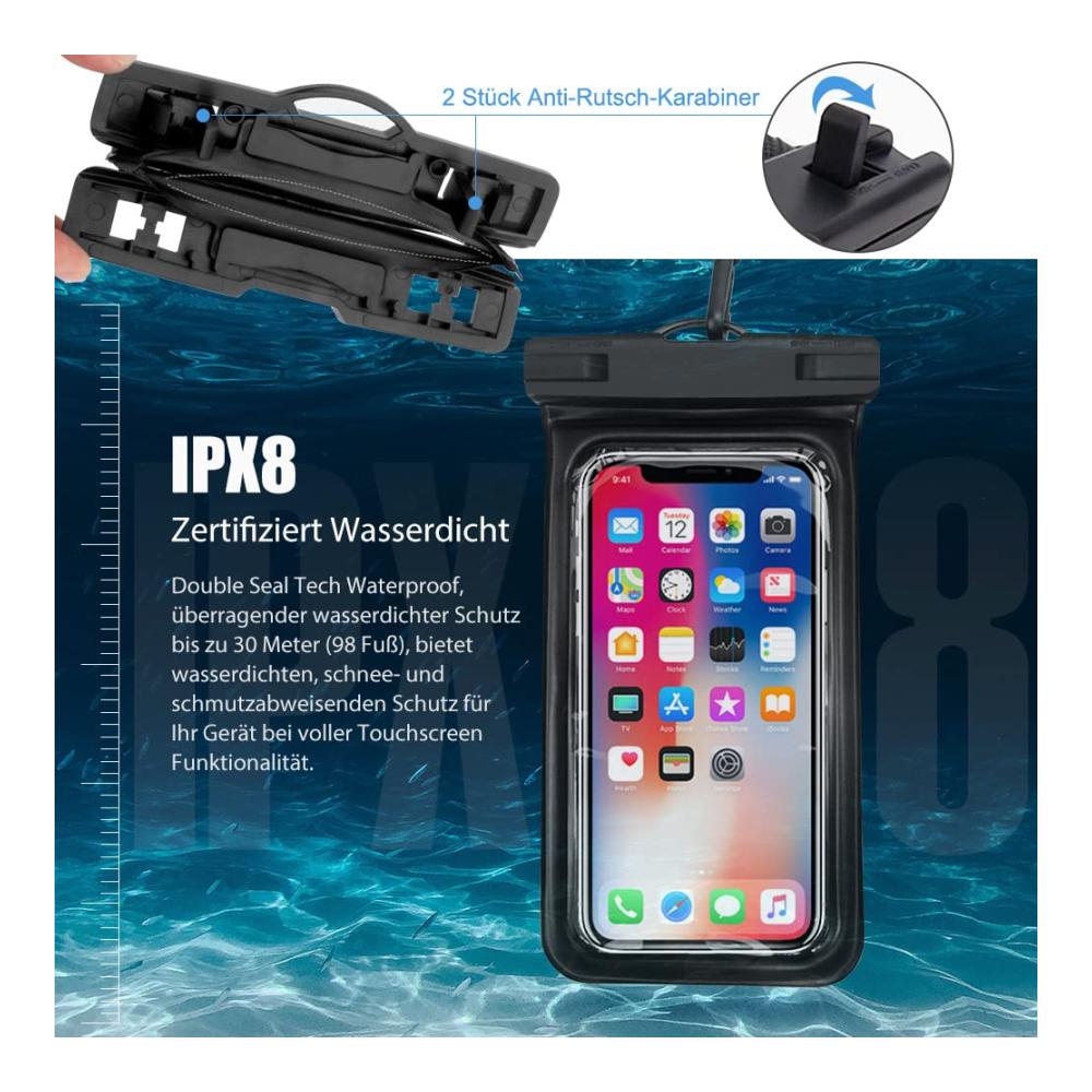 🏖️【Neueste Double Seal Tech】Der komplett neue Snap-and-Lock Verschlussclip und der vollständig geschlossene schwarze Rand helfen, Ihr Handy ständig vor Wassereindringlingen zu schützen. IPX8 zertifiziert wasserdicht, überlegener wasserdichter Schutz bis zu 98 Fuß (30 Meter), bietet wasserdichten schneefesten Schmutzschutz für Ihr Gerät bei gleichzeitiger Aufrechterhaltung der vollen Touchscreen-Funktionalität. (NICHT für Touch ID Fingerabdruck. )