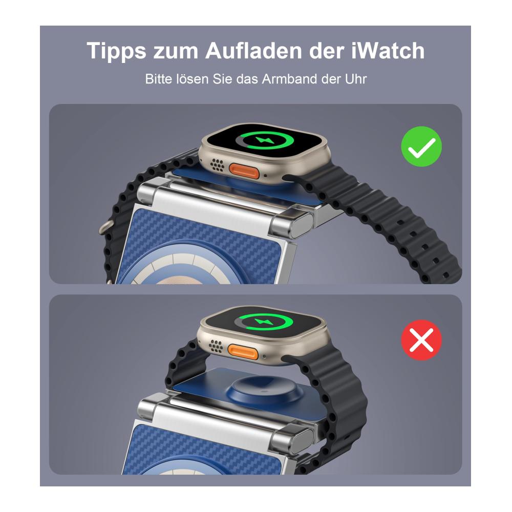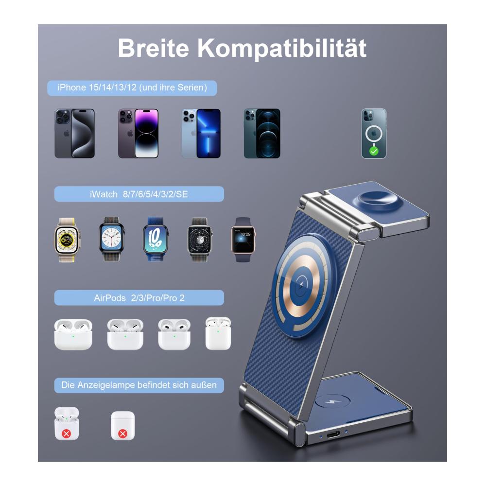 18W Intelligentes kabelloses Schnellladen für iPhone 15/14/13/12 Serie Pro/Pro Max/Plus. Für die Apple Watch SE2/8/7/6/SE/5/4/3/2 beträgt die Leistung 2,5W, für die AirPods 2/3 Pro 1/2 beträgt sie 5W. Diese Mag-Safe kabellose Schnellladestation kann gleichzeitig iPhone, iWatch und AirPods aufladen. (Bitte beachten Sie, dass nur die oben genannten Apple-Geräte unterstützt werden und andere Marken nicht unterstützt werden.)