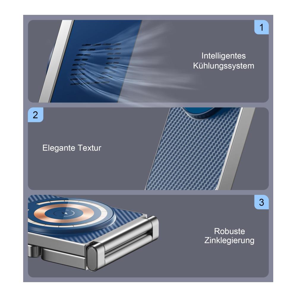 ZINKLEGIERUNG Apple Ladestation 3 in 1 — Diese einzigartige Handyladestation ist gut gestaltet mit exzellenter Textur und modischem Erscheinungsbild. Der drahtlose Ladegerät verfügt über einen Zinklegierungsrahmen, der ihm eine ausgezeichnete Textur und Optik verleiht, sowie einen stilvollen Streifen auf der Vorderseite. Sowohl die visuelle Wirkung als auch das Gefühl und das Erscheinungsbild sind erstaunlich!