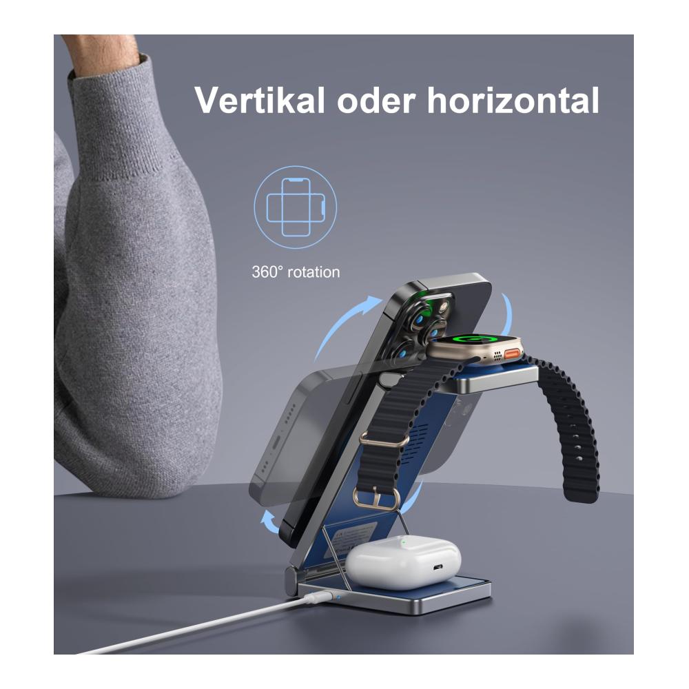 Stellen Sie Ihr iPhone vertikal oder horizontal ab — Die iPhone-Ladestation mit Schnellladefunktion kann auch als Telefonständer verwendet werden, wenn Sie Ihr iPhone nicht aufladen müssen. Es handelt sich um einen vielseitigen 3-in-1 Mag-Safe Ständer.