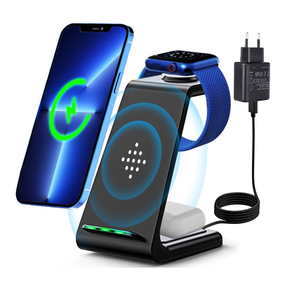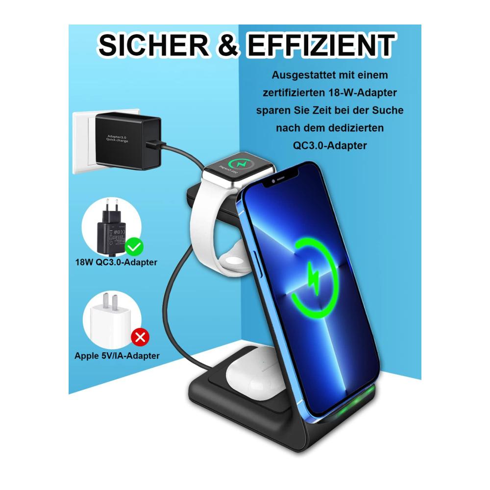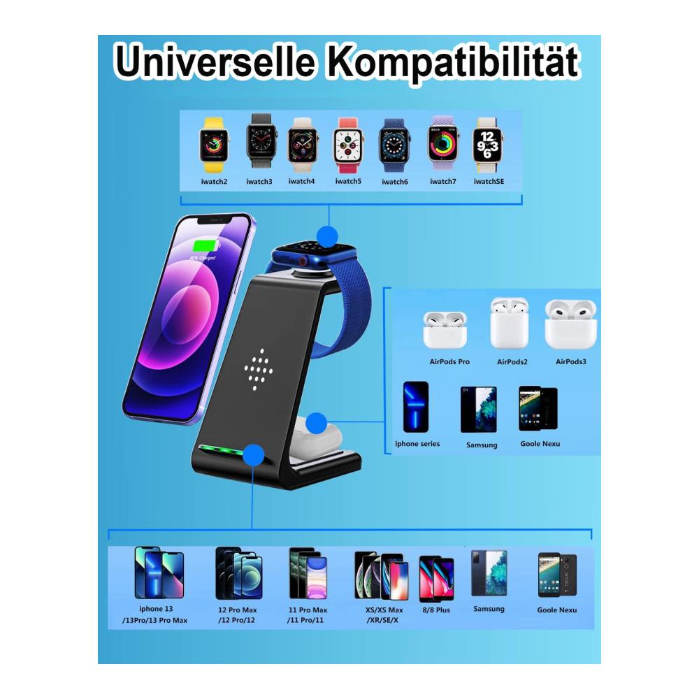 Unser Kabelloses 3-in-1 Induktives Ladegerät ist die ideale Lösung für all Ihre Ladebedürfnisse. Mit Qi-Schnellladefunktion können Sie Ihr iPhone, Ihre Apple Watch und Ihre AirPods gleichzeitig aufladen. Die Kompatibilität erstreckt sich auf eine Vielzahl von Geräten, einschließlich iPhone, Samsung, Huawei und mehr. Das Ladegerät wird mit einem Ladekabel, einem Stecker und einer Bedienungsanleitung geliefert. Erleben Sie bequemes und effizientes Laden mit unserem hochwertigen Ladegerät.