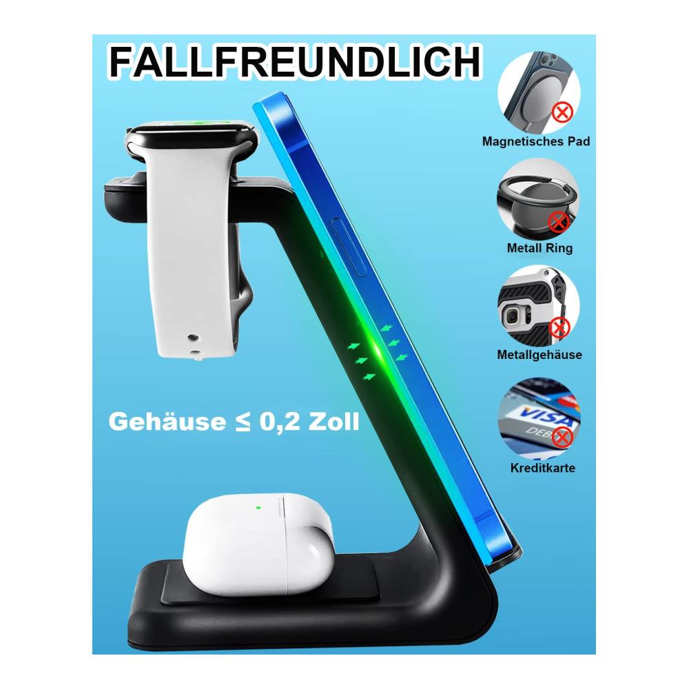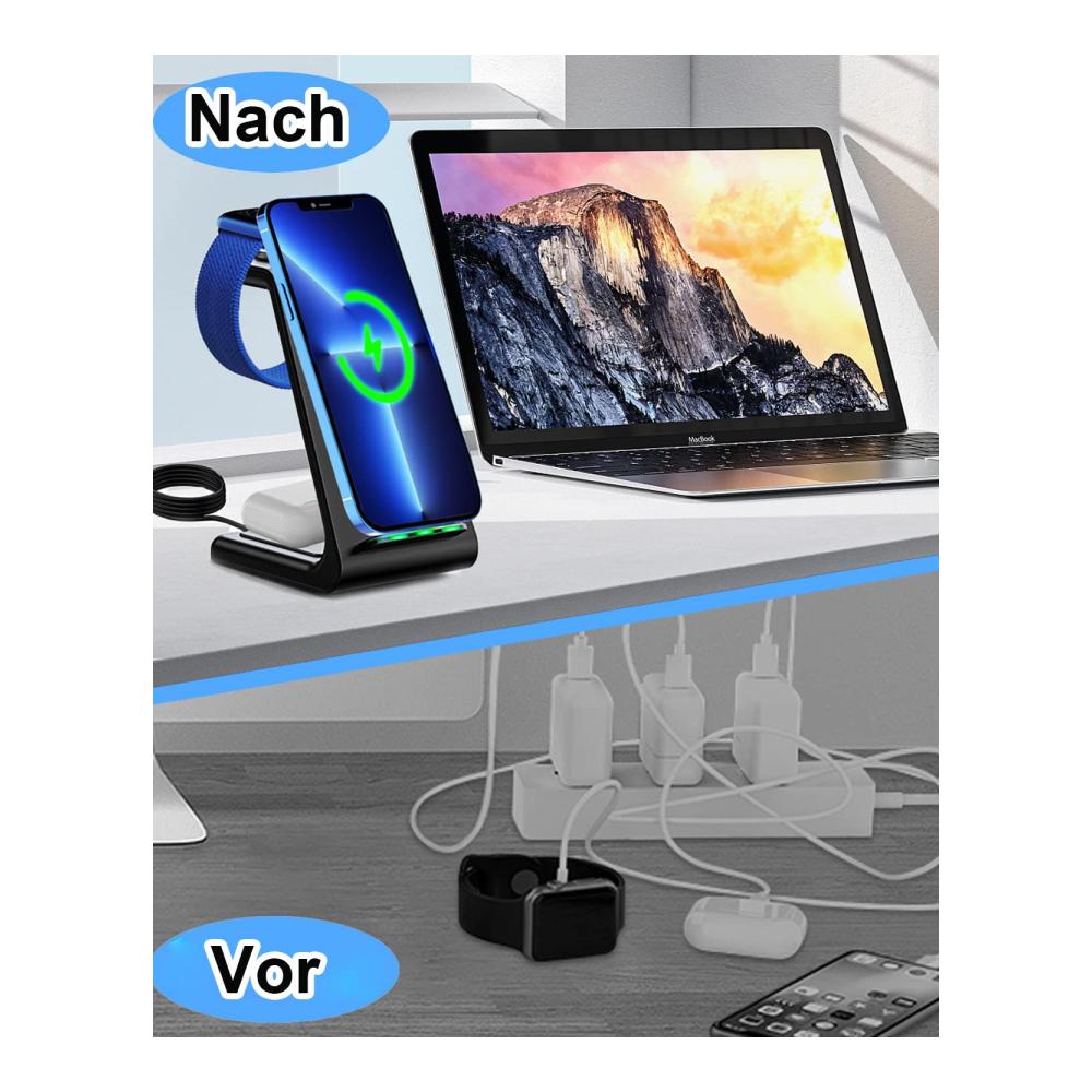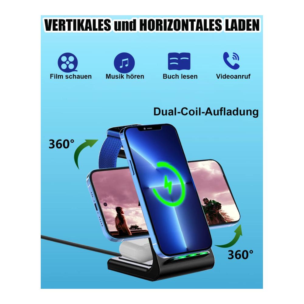 Ladekontrollleuchte an der Schnelles LadestationSchnelles drahtloses Ladegerät verfügt über drei Kontrollleuchten, die jeweils drei Geräten entsprechen. Wenn die Kontrollleuchte dauerhaft leuchtet, dass das Gerät aufgeladen wird. Wenn die Anzeige aus ist, Zeigt an, dass sich das Schnellladegerät im Standby-Modus befindet. Die Kontrollleuchte der kabelloser ladeständer kann während des Ladevorgangs nicht ausgeschaltet werden. | Umfangreich kompatibel3 in 1 Drahtloses Induktive Ladestation Kompatibel mit iPhone 15/15 Pro/15 Pro max/ iPhone 14/14 Pro/14 Pro max/13/13 Pro/13 Pro max/12/12 Pro / 12 Pro Max / 11/11 Pro / 11 Pro Max / XR / XS / XS Max / 8/8 plus, Ladestation apple watch und iphone Kompatibel mit iWatch 6/5/4/3/2 / SE(Nicht kompatibel mit iwatch 7), air pods Pro / 2 / Samsung Galaxy Note10 / S10 / S10 / S9 / S9 / S8 / S8 und weitere Qi-kompatible Smartphones. | Dual-Coil-AufIadungDas Mobiltelefon kann beim Laden um 360° gedreht werden und kann zur einfachen Verwendung frei zwischen horizontalen und vertikalen Bildschirmen umgeschaltet werden. |