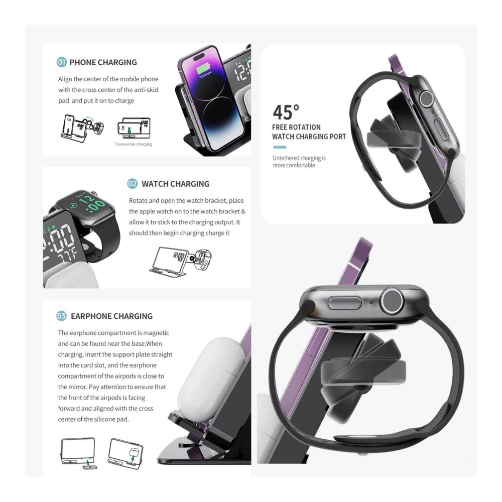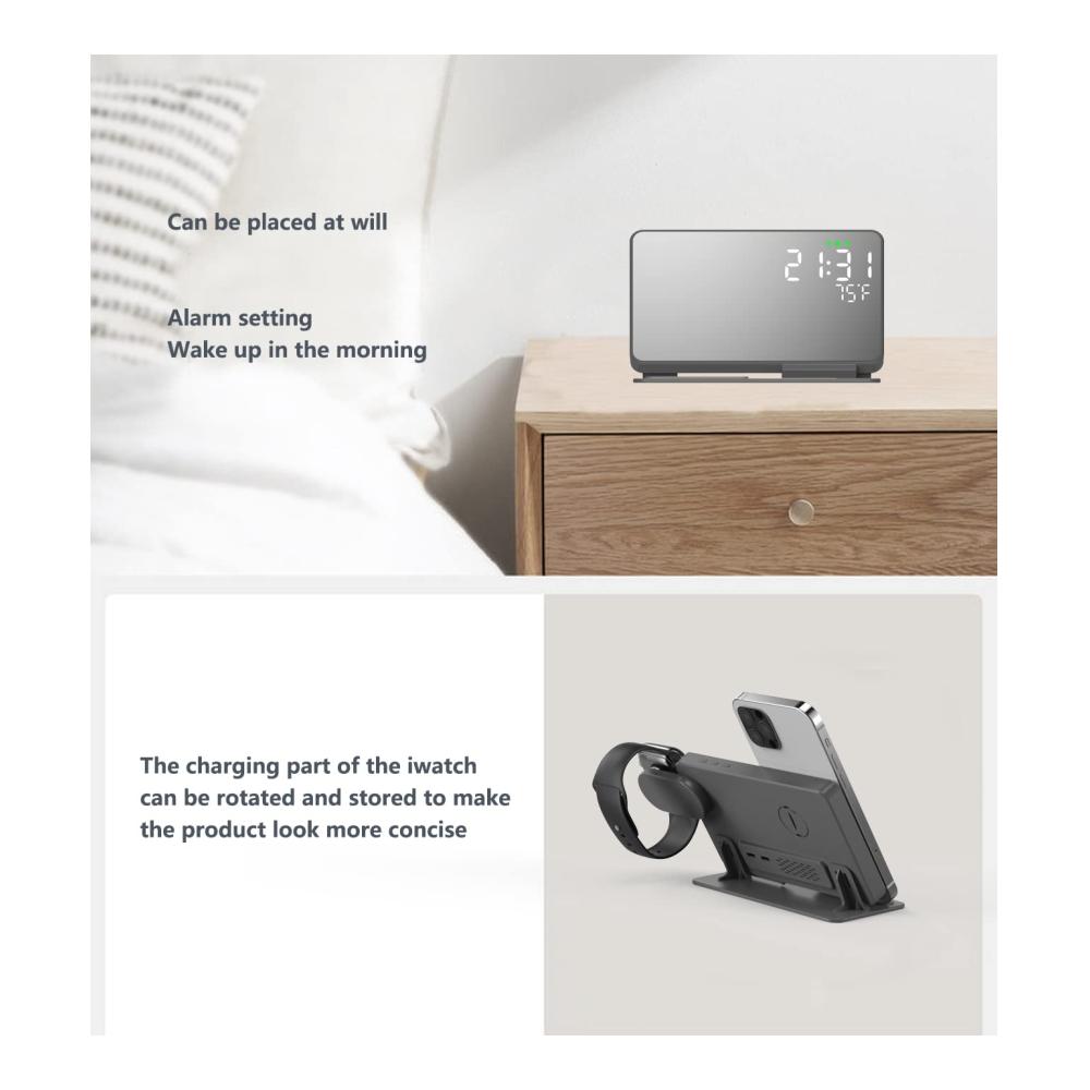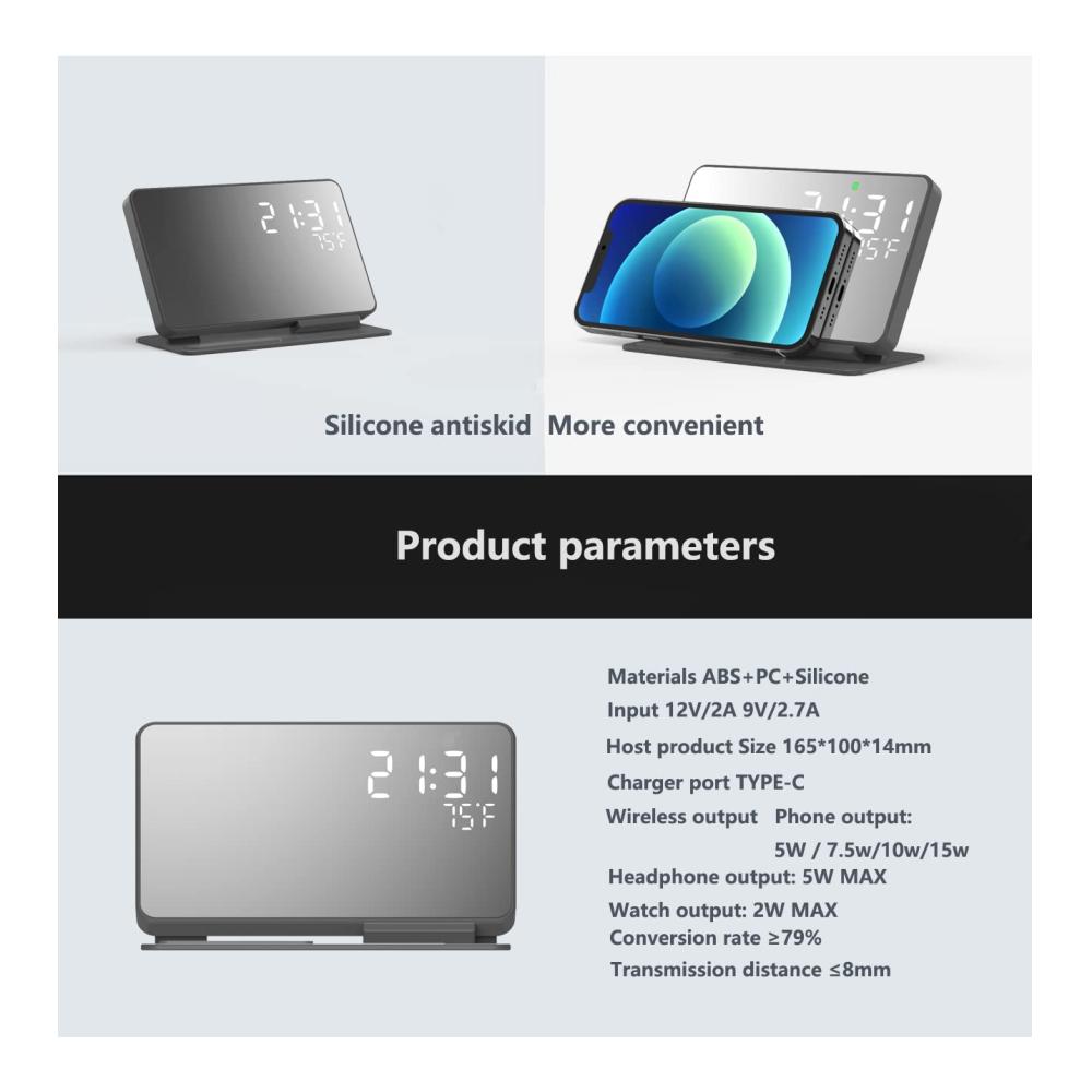 Unser 3-in-1 Kabelloses Ladegerät mit Spiegelfläche Digitaluhr bietet eine innovative Lösung für Ihre Ladebedürfnisse. Kompatibel mit einer Vielzahl von Geräten, einschließlich iPhone 14/13/12/11/mini Air Pods und Samsung Galaxy Serie. Dieses Ladegerät ist mit einem verbesserten intelligenten Chip ausgestattet, um Ihre Geräte vor Überhitzung und Überladung zu schützen. Die digitale Uhr zeigt nicht nur die Zeit an, sondern fungiert auch als praktischer Desktop-Spiegel. Mit einer Vielzahl von Ladeoptionen und universeller Kompatibilität ist es die perfekte Ergänzung für Ihren Schreibtisch oder Nachttisch.