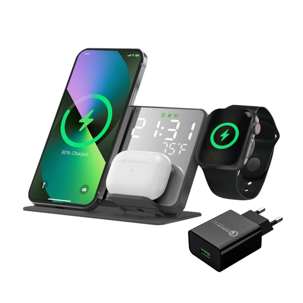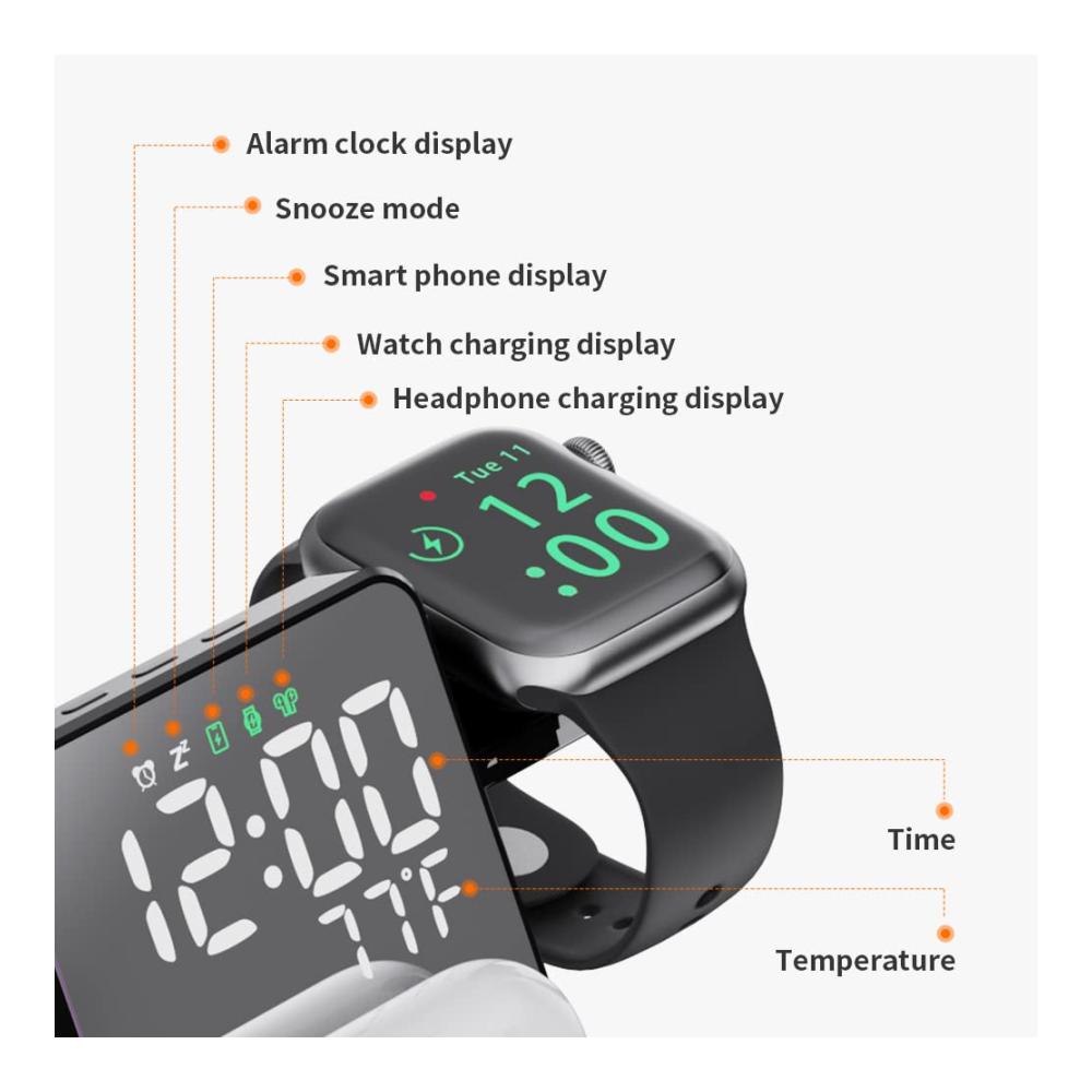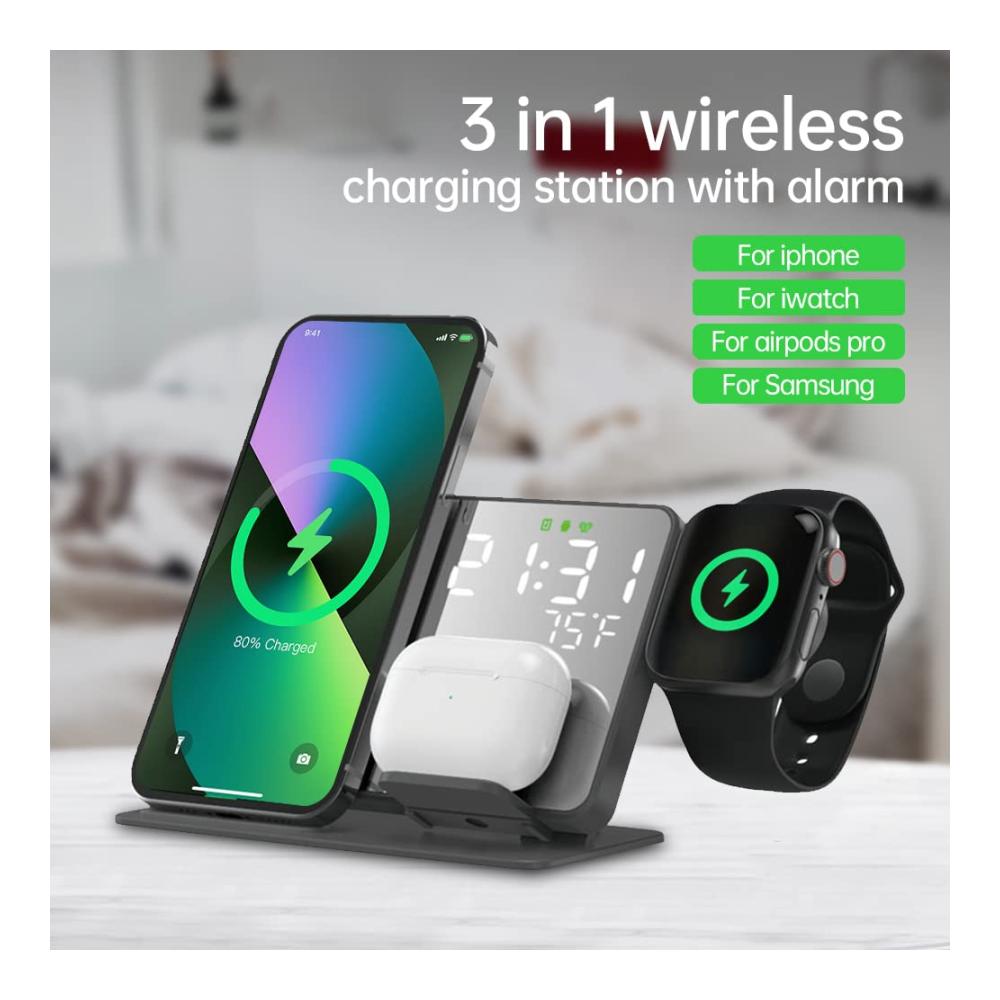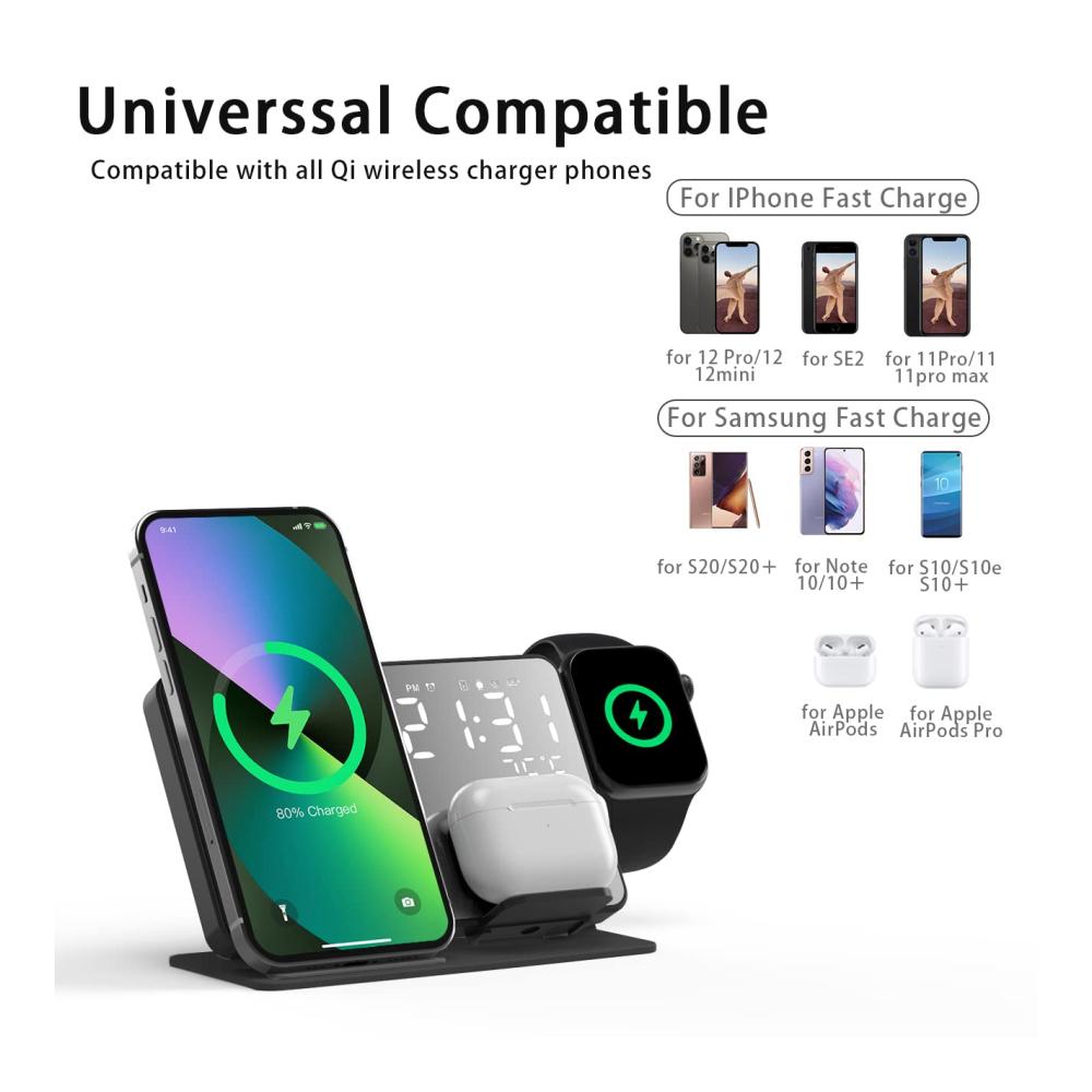 Unser 3-in-1 Kabelloses Ladegerät mit Spiegelfläche Digitaluhr bietet eine innovative Lösung für Ihre Ladebedürfnisse. Kompatibel mit einer Vielzahl von Geräten, einschließlich iPhone 14/13/12/11/mini Air Pods und Samsung Galaxy Serie. Dieses Ladegerät ist mit einem verbesserten intelligenten Chip ausgestattet, um Ihre Geräte vor Überhitzung und Überladung zu schützen. Die digitale Uhr zeigt nicht nur die Zeit an, sondern fungiert auch als praktischer Desktop-Spiegel. Mit einer Vielzahl von Ladeoptionen und universeller Kompatibilität ist es die perfekte Ergänzung für Ihren Schreibtisch oder Nachttisch.