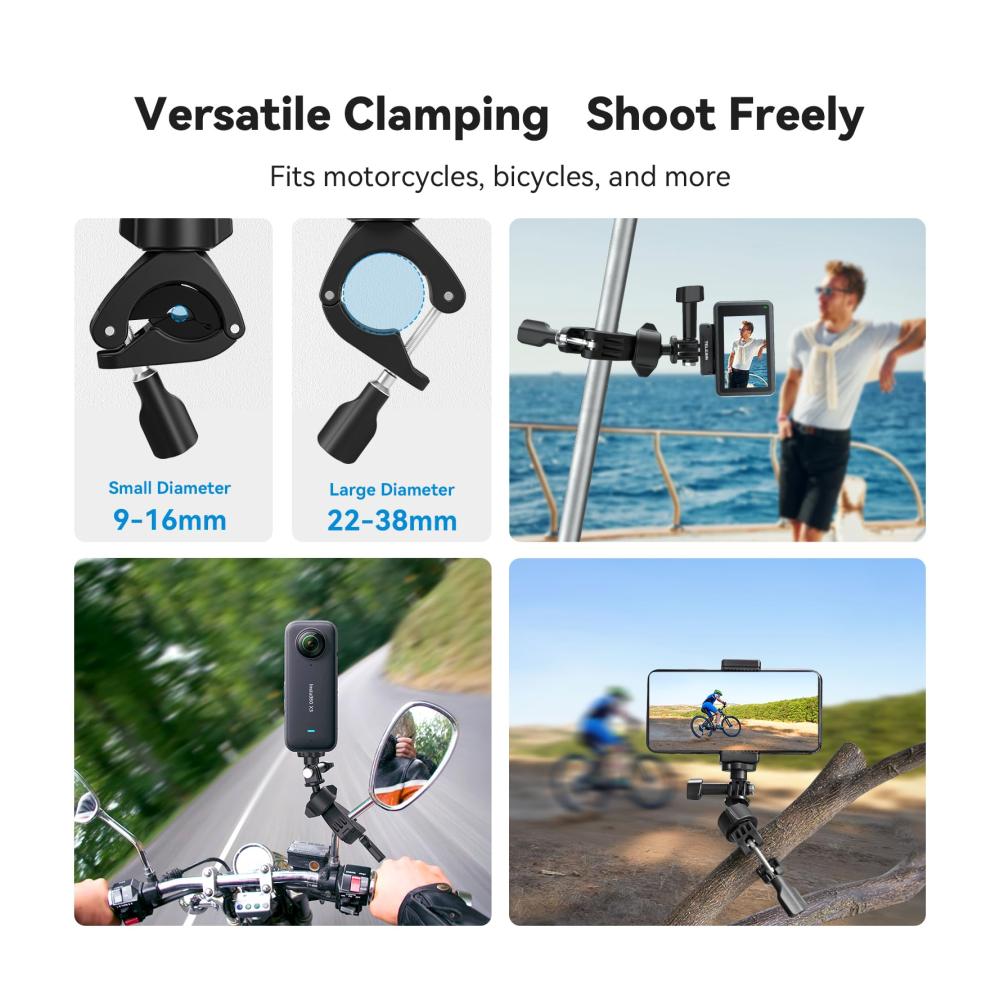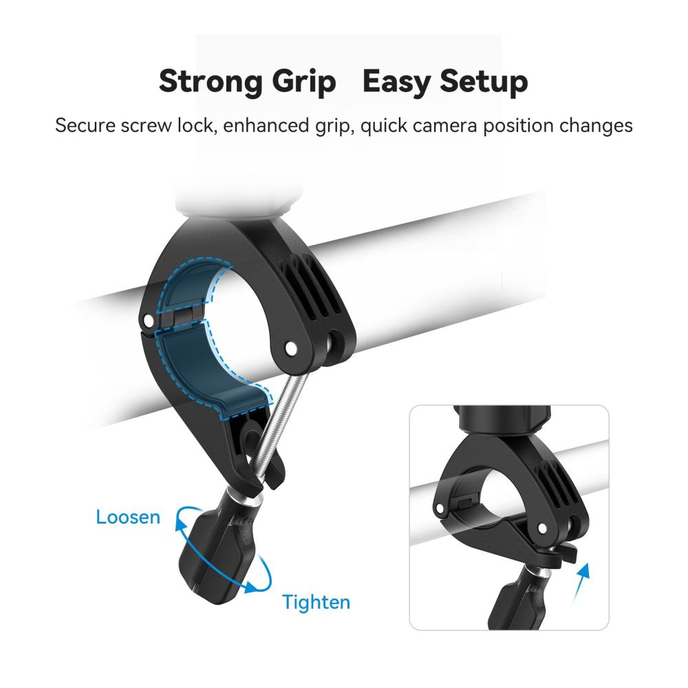 Die 360° drehbare Kugelhalterung ermöglicht einen flexiblen Aufnahmewinkel und schnelle Ansichtswechsel. Dank des geringen Gewichts und des stabilen Designs ist diese Rohrschellenklemme perfekt für Actionaufnahmen geeignet. Das eingebaute weiche Gummipolster sorgt für sicheren Halt und minimiert Vibrationen.