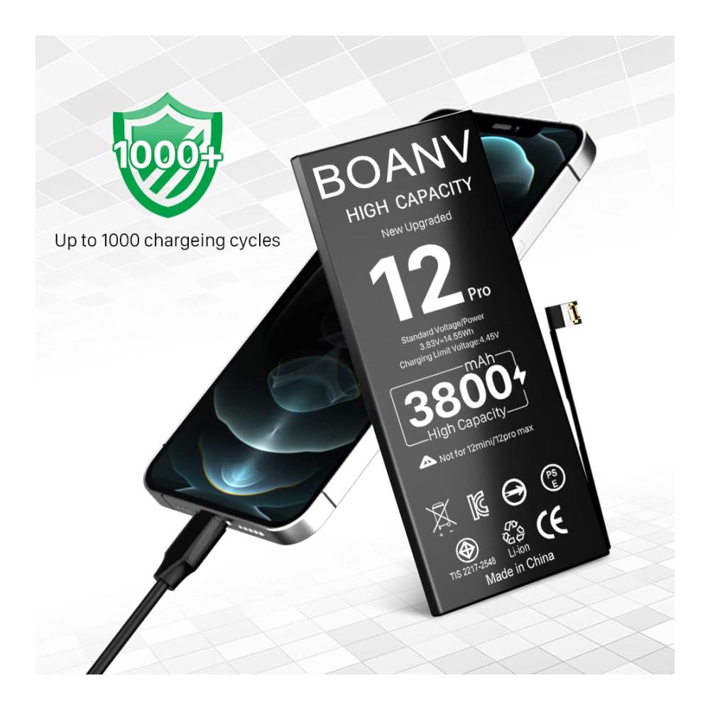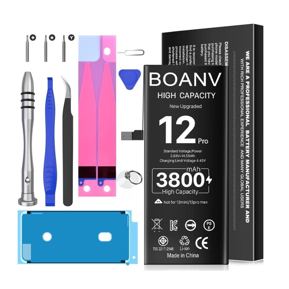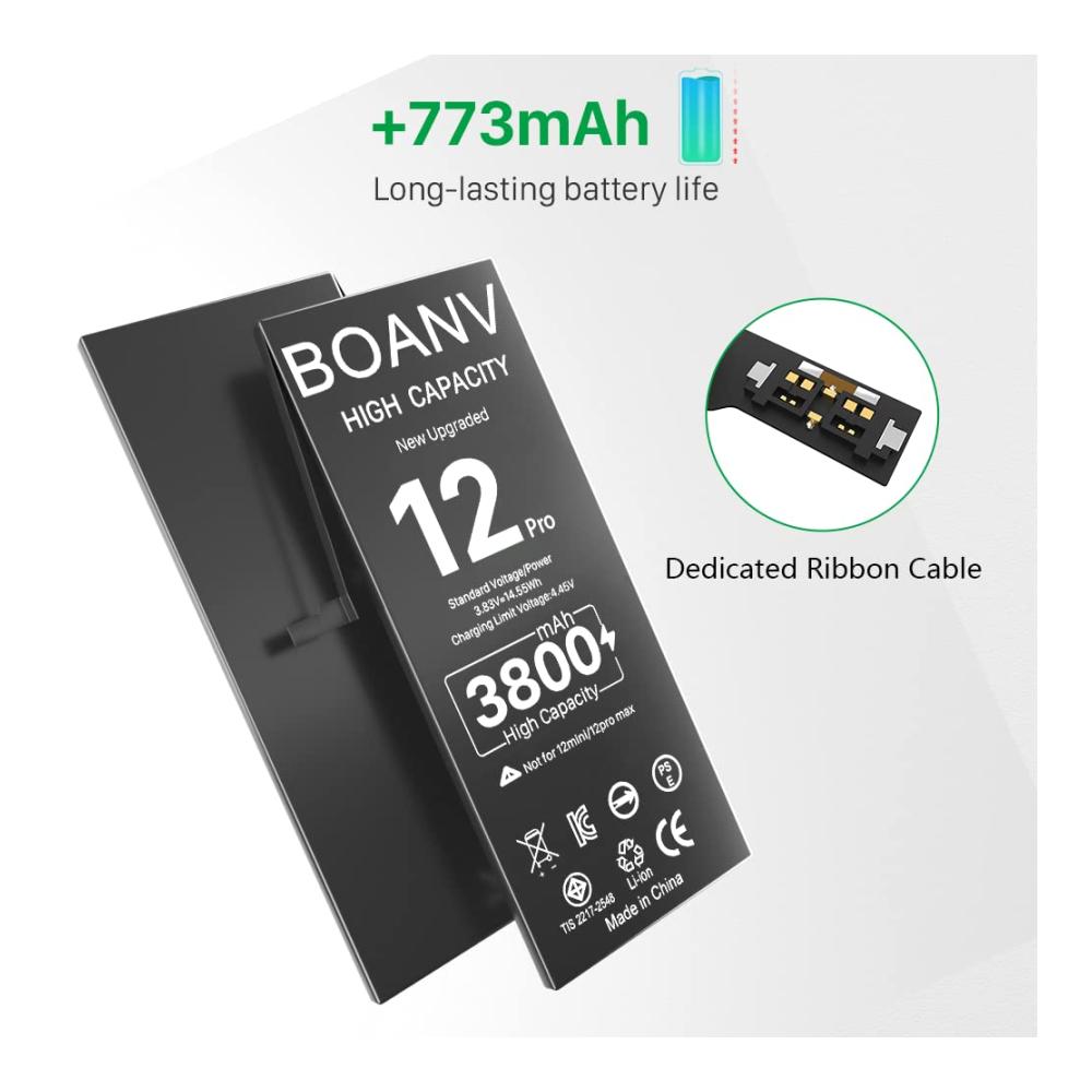 Verbessern Sie die Leistung Ihres iPhone 12/12 Pro mit dem hochwertigen Akku von Boanv. Mit einer Kapazität von 3800mAh bietet dieser Ersatzakku mehr Zeit für die Nutzung Ihres Telefons. Kompatibel mit den Modellen A2407, A2341, A2406 und A2408.