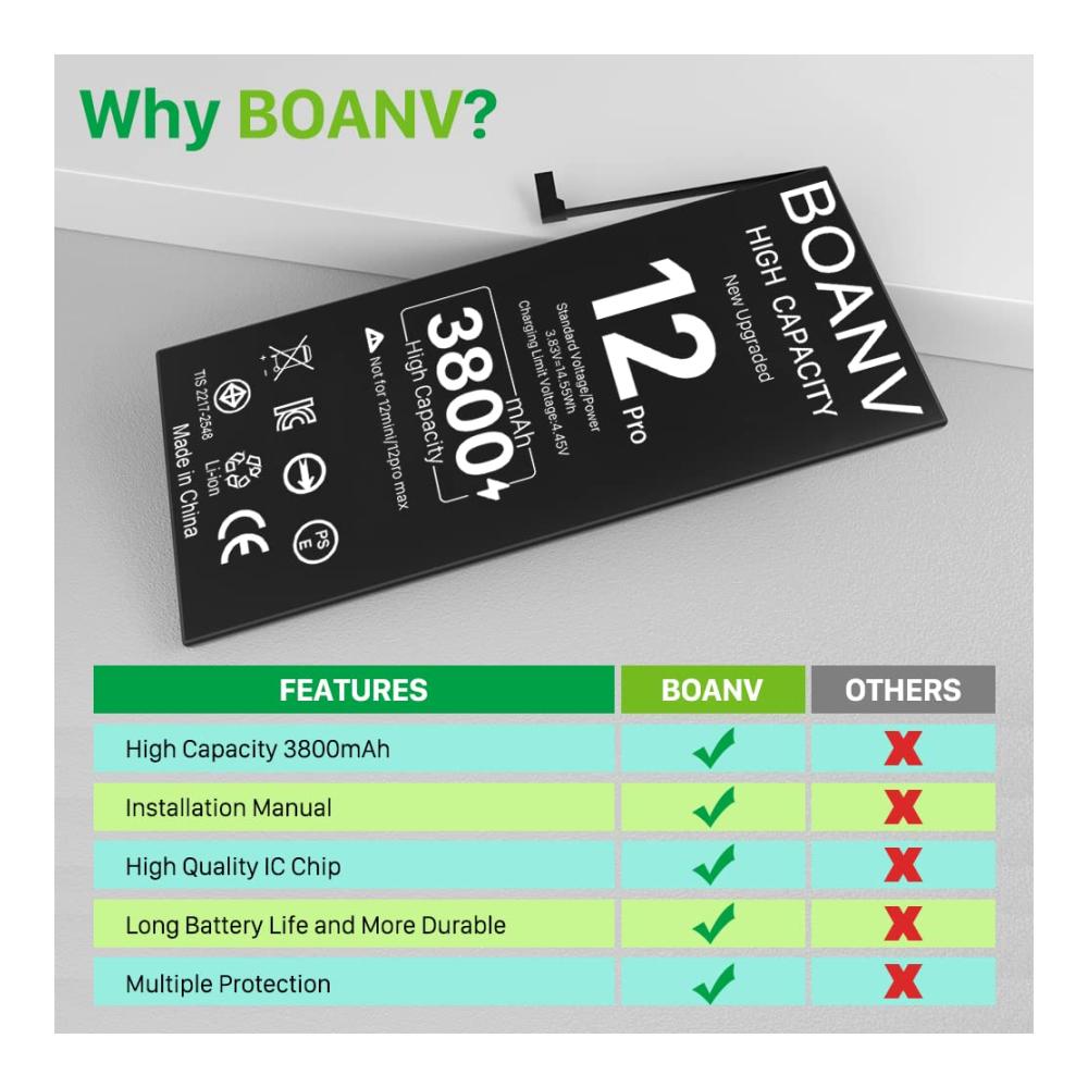 【Kompatible Modelle】: Boanv Ersatz-Akku für iPhone12/12 Pro, ModellA2407 A2341 A2406 A2408. (Hinweis: Nicht kompatibel mit iPhone 11 oder anderen iPhone-Modellen). Bitte bestätigen Sie die Modellnummer Ihres iPhones, bevor Sie bestellen. Hinweis: Bitte sehen Sie vor der Installation wichtige Videos im Internet an.