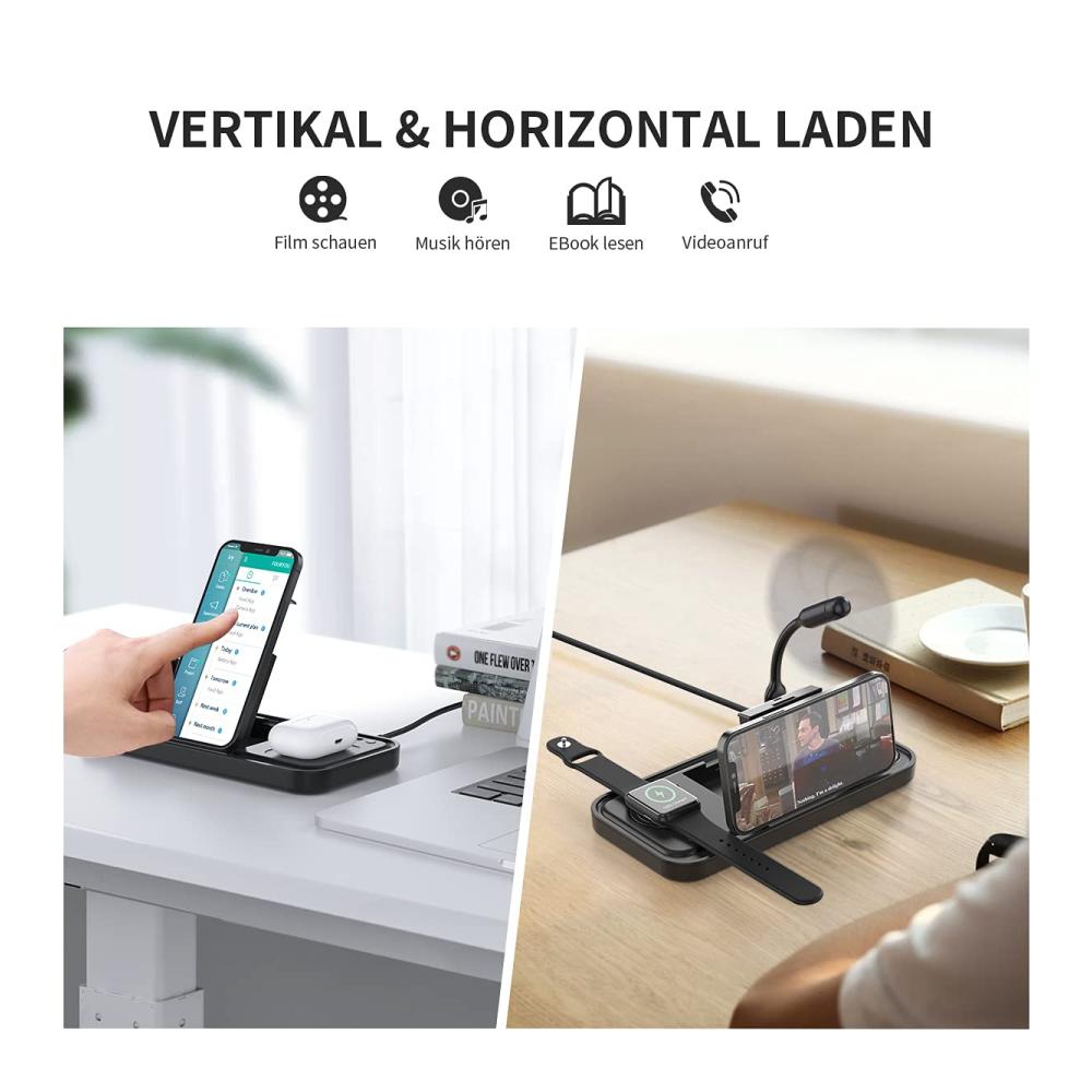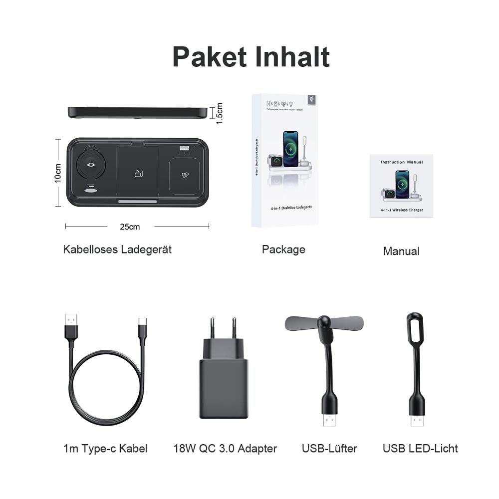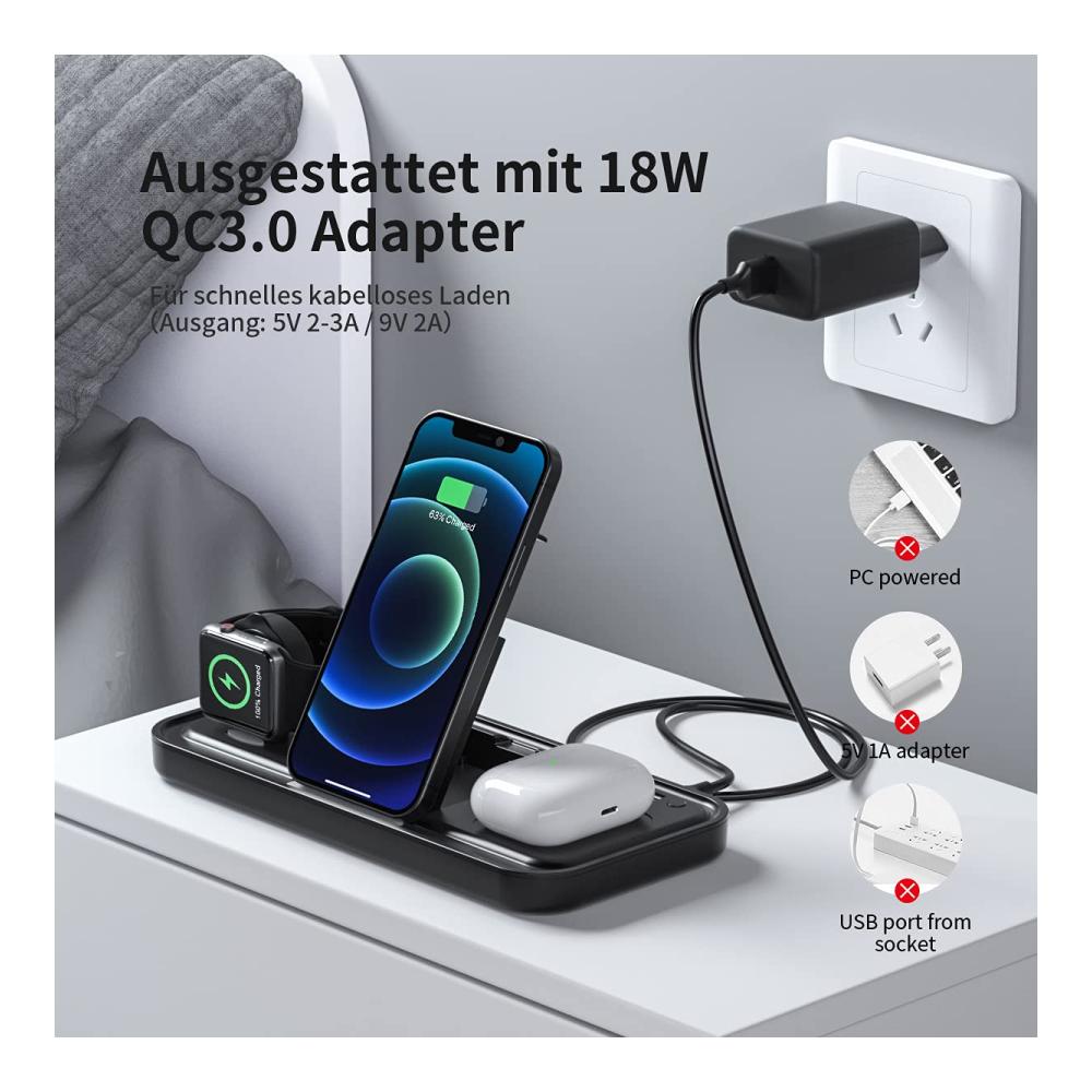 【4-in-1-Schnellladegerät mit QC 3.0-Adapter】Mit Qi-Zertifiziert Kabelloses Ladegerät, 4-in-1 Induktive ladestation Kompatibel für iPhone, Apple Watch, Airpods, Samsung, LG, HTC, Huawei, Sony, Xiaomi und weitere Qi-fähige Geräte.Laden Sie mehrere Geräte gleichzeitig an einem Ort,ordentlich und organisiert.