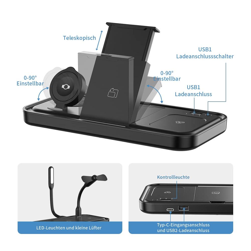 Erleben Sie ultimative Bequemlichkeit mit dem 4-in-1 Kabellosen Ladegerät von Jekeco. Dieses vielseitige Ladegerät ermöglicht schnelles kabelloses Laden für eine Vielzahl von Geräten, darunter Kopfhörer, Smartphones und Smartwatches. Dank des mitgelieferten 18W QC 3.0-Adapters ist schnelles Aufladen garantiert. Der verstellbare und klappbare Ständer ermöglicht es Ihnen, Ihr Handy vertikal oder horizontal aufzustellen, während das integrierte LED-Nachtlicht und der Mini-USB-Ventilator zusätzlichen Komfort bieten. Mit einer Vielzahl von Lademodi, einschließlich Schnellladung, ist dieses Ladegerät die perfekte Ergänzung für Ihr Zuhause oder Büro.