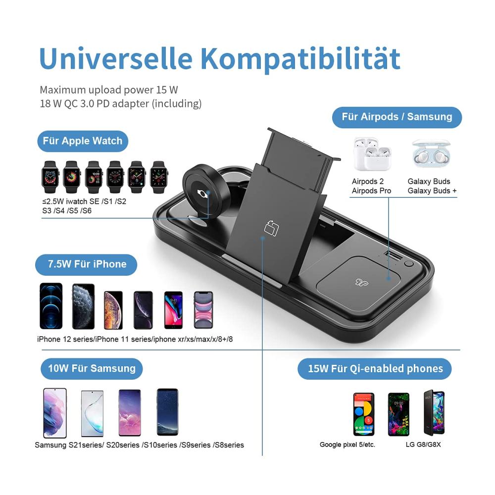 【Universelle Kompatibilität】 Max 15W kabellose Ladestation: 7.5W Schnellladung für iPhone 14/14 pro/14 max/14 pro max/13 mini/13/13 pro/13 pro max/12 Mini/ 12/11 Pro/12/11 Pro Max/SE/XS/XS Max/XR/ X/8P/8; iWatch 8/7/6/5/4/3/2/1/SE/Airpods Pro/3/2/ Galaxy Buds/Buds(≤3W);15W Schnellladung für LG Series phones; 10 W Schnellladung für Samsung Galaxy S20/S20P/S20 Ultra/S10/S10 /S10e/S9/S9/S8/S8 /S7/S7 Edge/S6 Edge/Note10/Note 9/Note 8; 5 W Standardladung für andere Qi-fähige Telefone.