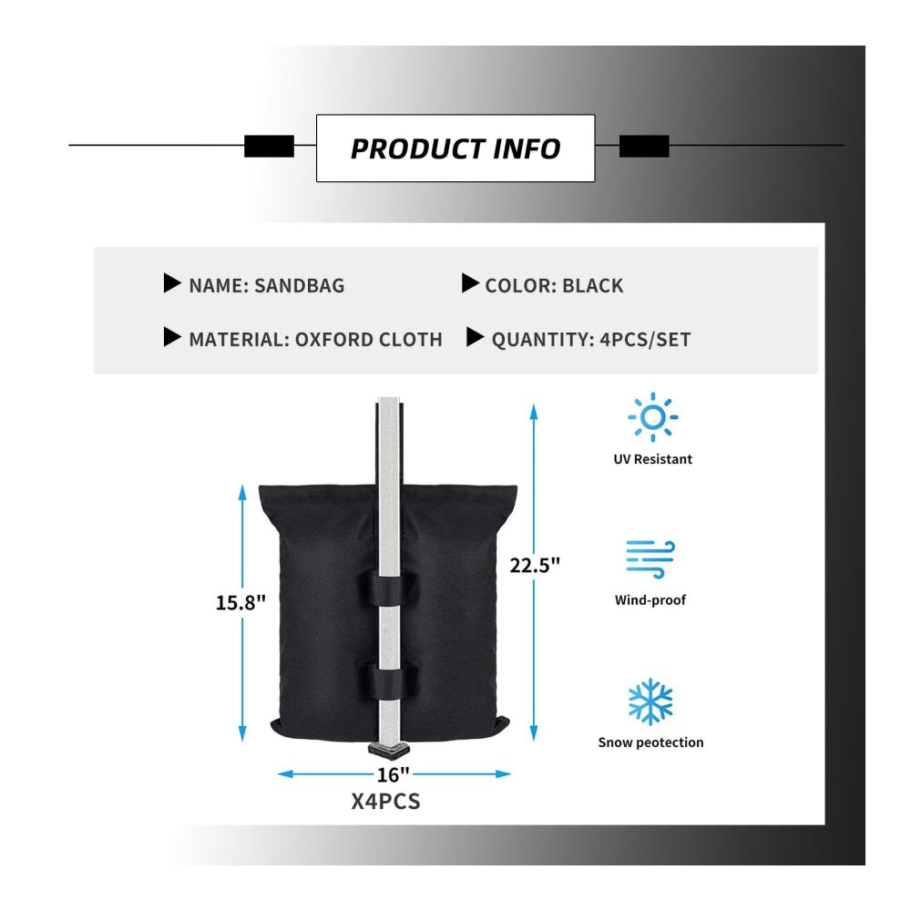 • Unsere hochwertigen Gewichtssäcke sind aus wasserdichtem 800D-Oxford-Gewebe mit PVC-Beschichtung gefertigt, um maximale Haltbarkeit und Sicherheit gegen Sandaustritt zu gewährleisten. Jeder Sandsack kann mit bis zu 9-11,3 kg Sand, Kies oder anderen Materialien befüllt werden und ist dank magischer Klebebanddichtungen einfach zu verwenden. Diese Gewichtstaschen stabilisieren Ihren Pavillon, Ihr Zelt oder Ihren Baldachin zuverlässig bei starkem Wind und sind perfekt für verschiedene Outdoor-Anlässe geeignet. Unverzichtbar für Märkte, Camping, Partys, Sportveranstaltungen und den Strand. Sorgen Sie überall für sicheren Halt Ihres Baldachins oder Zeltes.