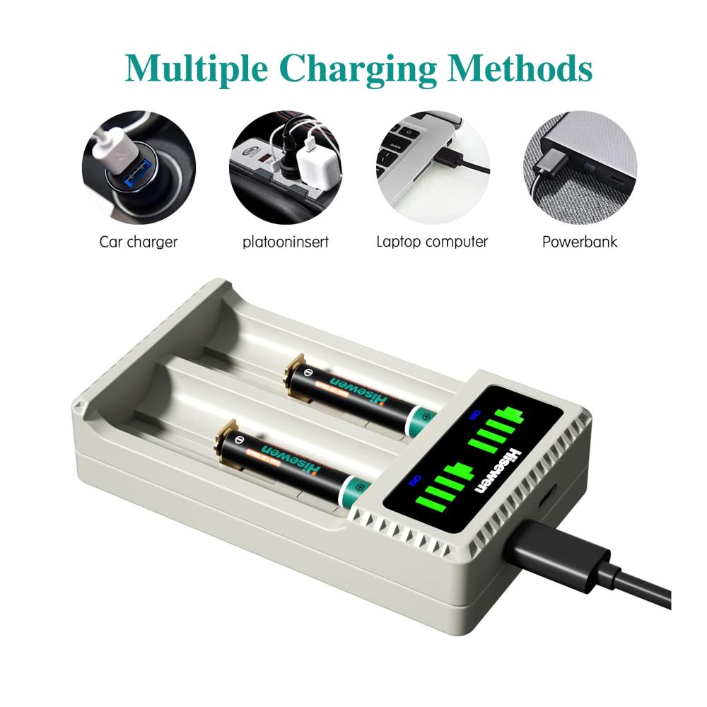 Schnelles Ladegerät: AA AAA Batterieladegerät hat Dual Input Micro USB und Type-C Input.【Charging Input】 5V/2A Max【Ladeausgang】. 1.48V/250mA. Es kann auch zwei Batterien gleichzeitig und unabhängig aufladen.