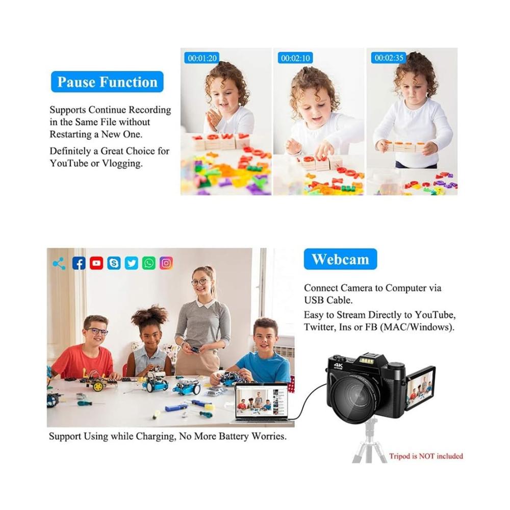 Unsere Kamera ist mehr als nur ein einfacher Camcorder – sie ist Ihr kreativer Begleiter für atemberaubende Aufnahmen. Mit beeindruckender 4K-Auflösung und einem leistungsstarken Weitwinkelobjektiv erfasst sie jedes Detail mit beeindruckender Klarheit. Egal, ob Sie professionelle Videos drehen oder unvergessliche Momente festhalten möchten, diese Kamera ist die perfekte Wahl.