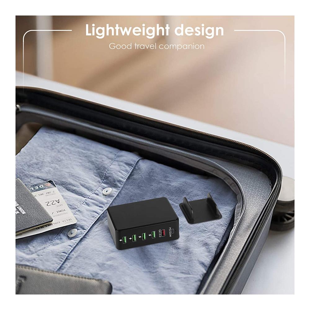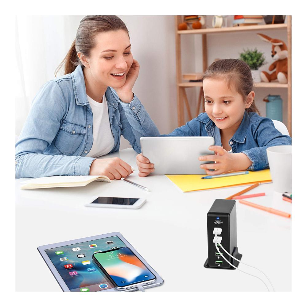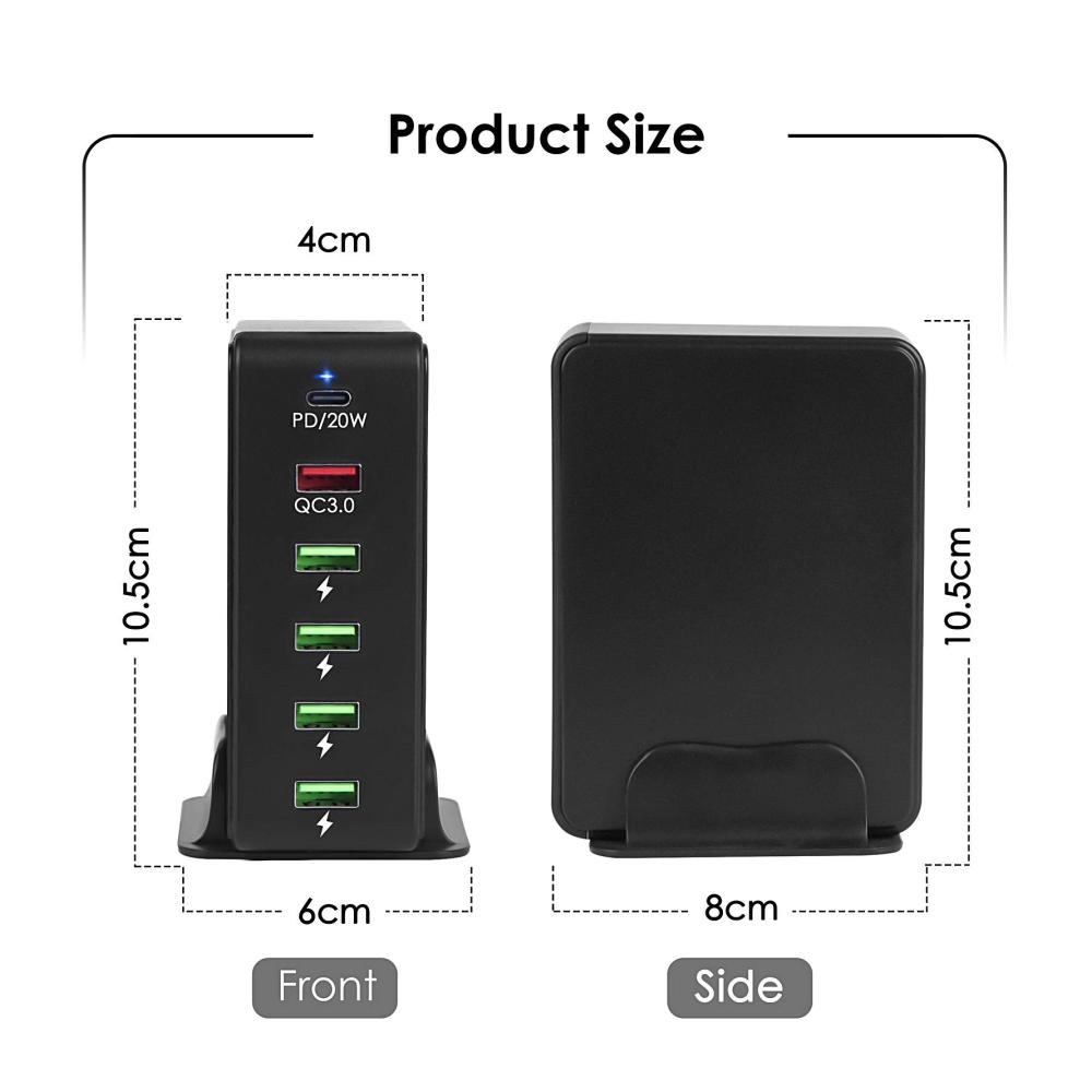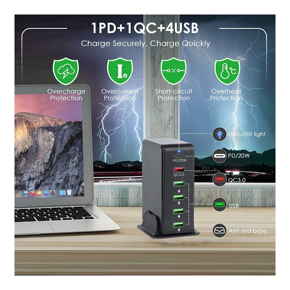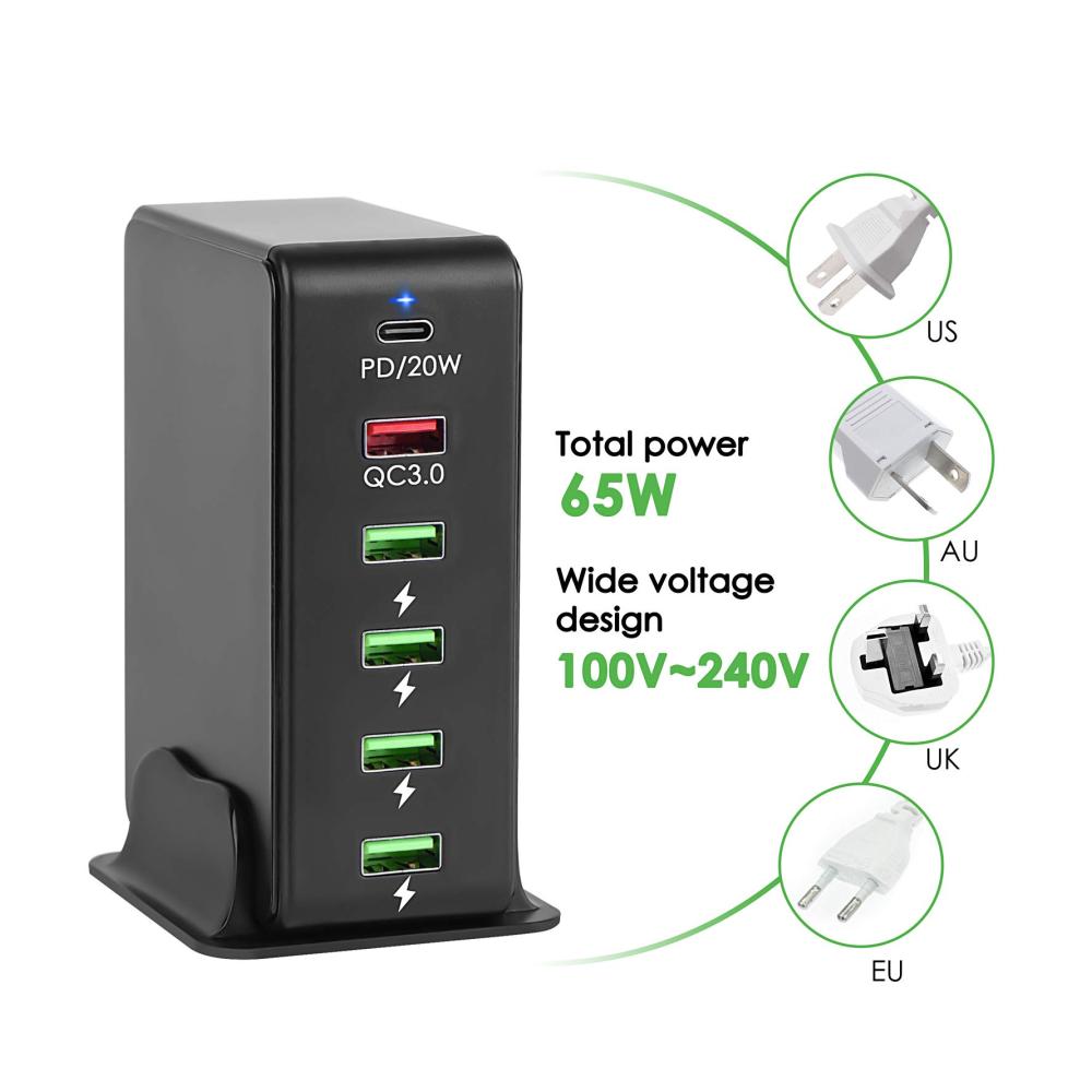 Mehrfach USB Ladestation: Die 65W USB Multi Ladestation verfügt über einen USB-C-Anschluss und fünf USB-Anschlüsse (darunter einen QC 3.0- und vier 5-V-USB-Anschlüsse). Sie dient zum gleichzeitigen Laden von 6 Geräten mit voller Geschwindigkeit für eine stabilere Aufladung. Geschwindigkeit und kompatibel mit den meisten Geräten.