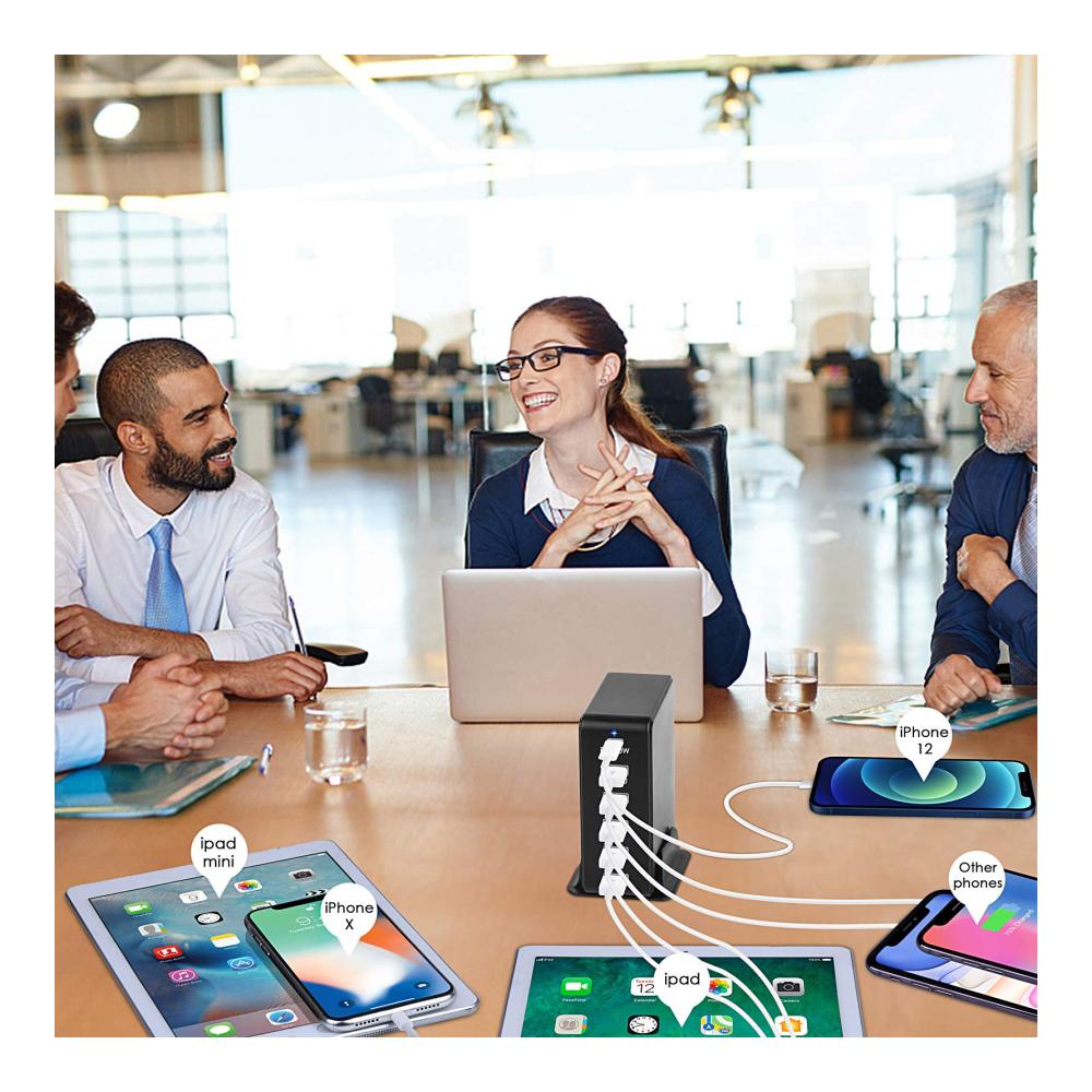 Kompaktes Design: intelligenten USB Ladegerät mit Angemessenes Erscheinungsbild(218 g), Sie können sechs Geräte gleichzeitig aufladen. Das abnehmbare Netzkabel und ein praktischer Ständer sind ebenfalls im Lieferumfang enthalten, sodass Sie beim Aufladen viel mehr Freiheit haben.