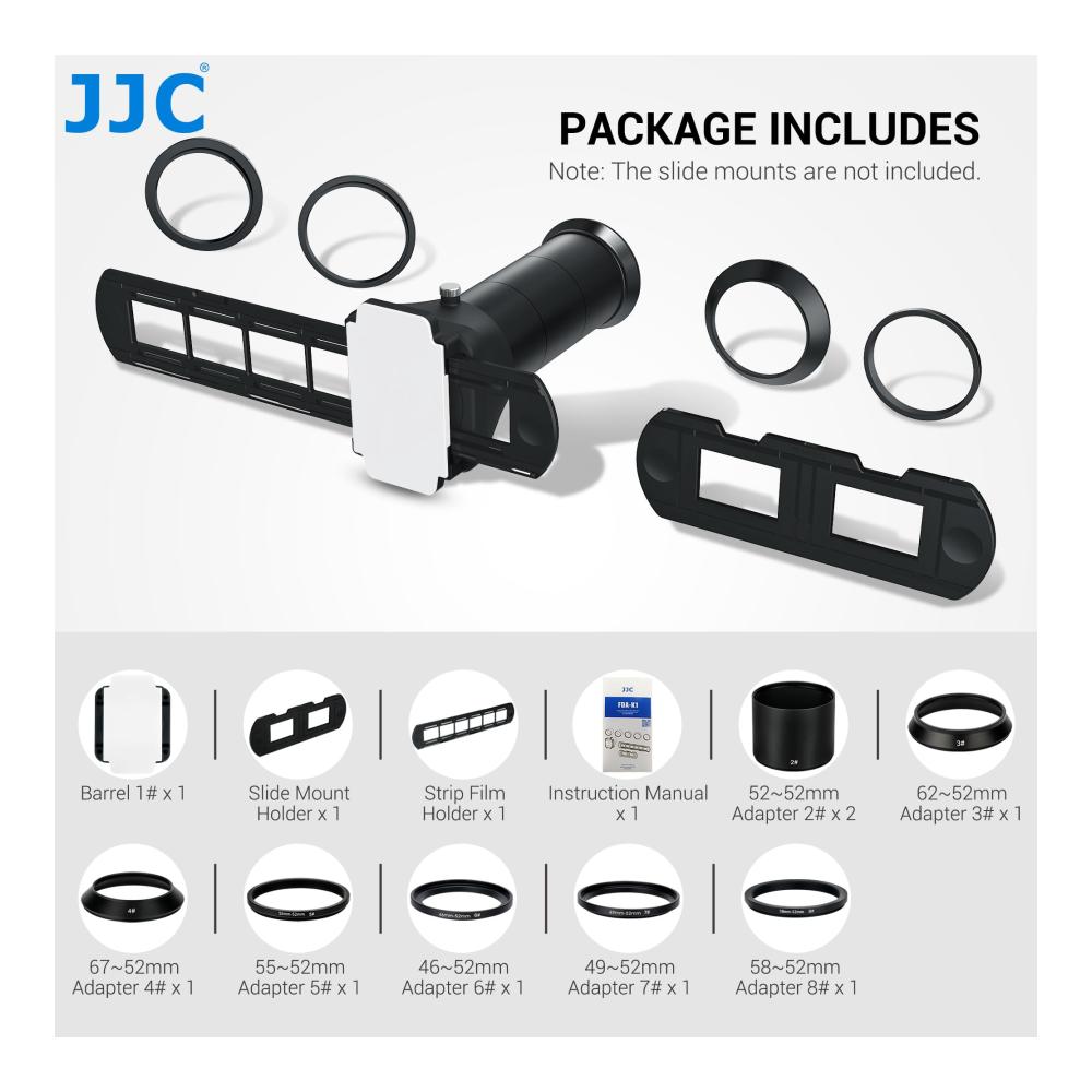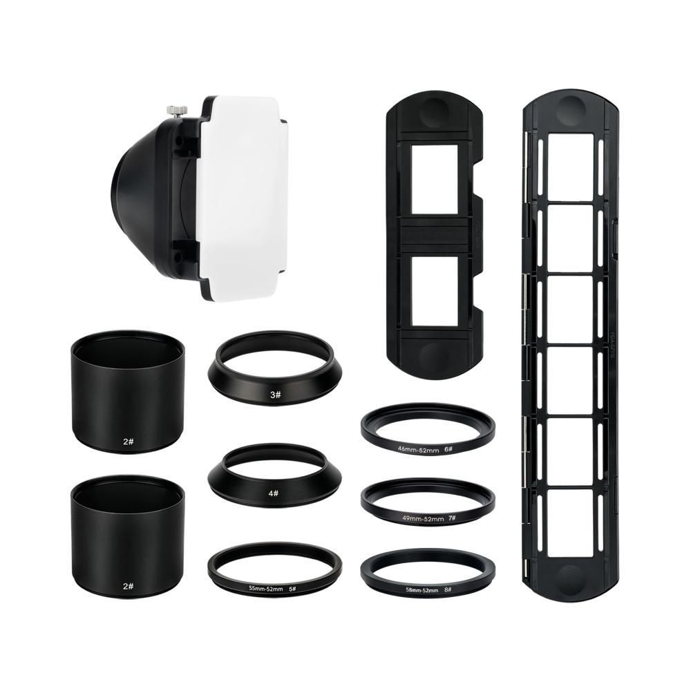 • 【Komplettes Zubehör】Funktioniert mit 1 x 35mm/135mm Filmhalter (Negativhalter), 1 x 35 mm / 135 mm Slide-Halter (Positiver Halter), 7 x Fass-Objektivadapter, ermöglicht es Ihnen, das Set an verschiedenen Objektiven zu befestigen und der Blickwinkel und die Neigung können durch die Verwendung des Blickwinkel-Einstellrings am Schaft eingestellt werden