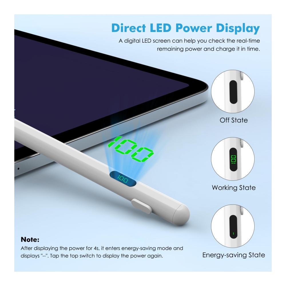 • 【Direkte LED-Leistungsanzeige】Genießen Sie unsere gut lesbare LED-Leistungsanzeige auf dem Stylus-Stift für das iPad. Berühren Sie leicht den oberen Schalter des Stylus-Stifts, um den Batteriestand jederzeit und überall in Echtzeit anzuzeigen. (Nachdem die Leistung 4 Sekunden lang angezeigt wurde, wechselt es in den Energiesparmodus und zeigt „–“ an. Klicken Sie erneut auf den oberen Schalter, um die Leistung anzuzeigen.)