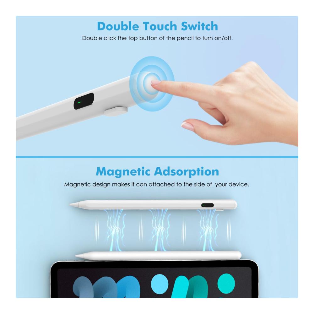 • 【Magnetische Befestigung und Doppeltipp-Touch-Schalter】Dieser Stylus Pen für Android kann magnetisch an der Seite Ihres Tablets befestigt werden und schützt es so vor Wegrollen und Herunterfallen, sodass es bequemer zu tragen und zu verwenden ist. (Nur magnetische Befestigungsfunktion, kein magnetisches Laden.) Doppelklicken Sie beim Touch-Schalter-Design auf den Touch-Schalter oben, um ihn schnell ein- und auszuschalten. Nach dem Einschalten kann die aktuelle Akkuleistung angezeigt werden.
