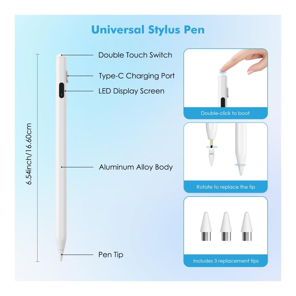 • Entdecken Sie den MoKo Stylus Pen für Touchscreens in Weiß mit Power Display. Dieser aktive Universal Stift ist mit den meisten iOS/Android Tablets kompatibel. Dank der Direkten LED-Leistungsanzeige wissen Sie immer, wie viel Energie noch übrig ist. Der Stift verfügt über Schnellladung und Auto-Sleep-Design für effiziente Nutzung. Die magnetische Befestigung und der Doppeltipp-Touch-Schalter machen ihn praktisch in der Anwendung. Er bietet hohe Präzision und reibungsloses Schreiben. Erhalten Sie alles Notwendige für eine optimale Nutzung.