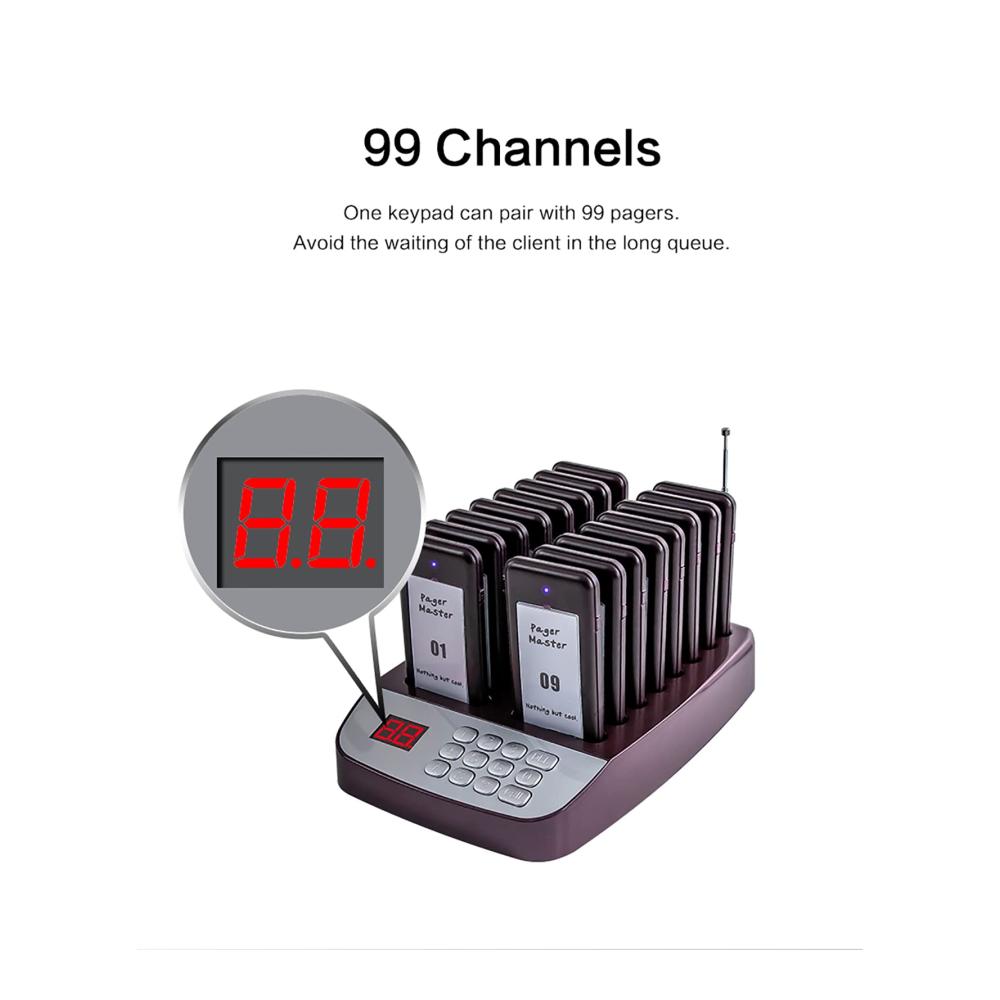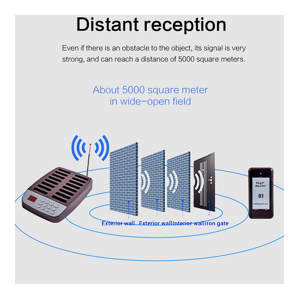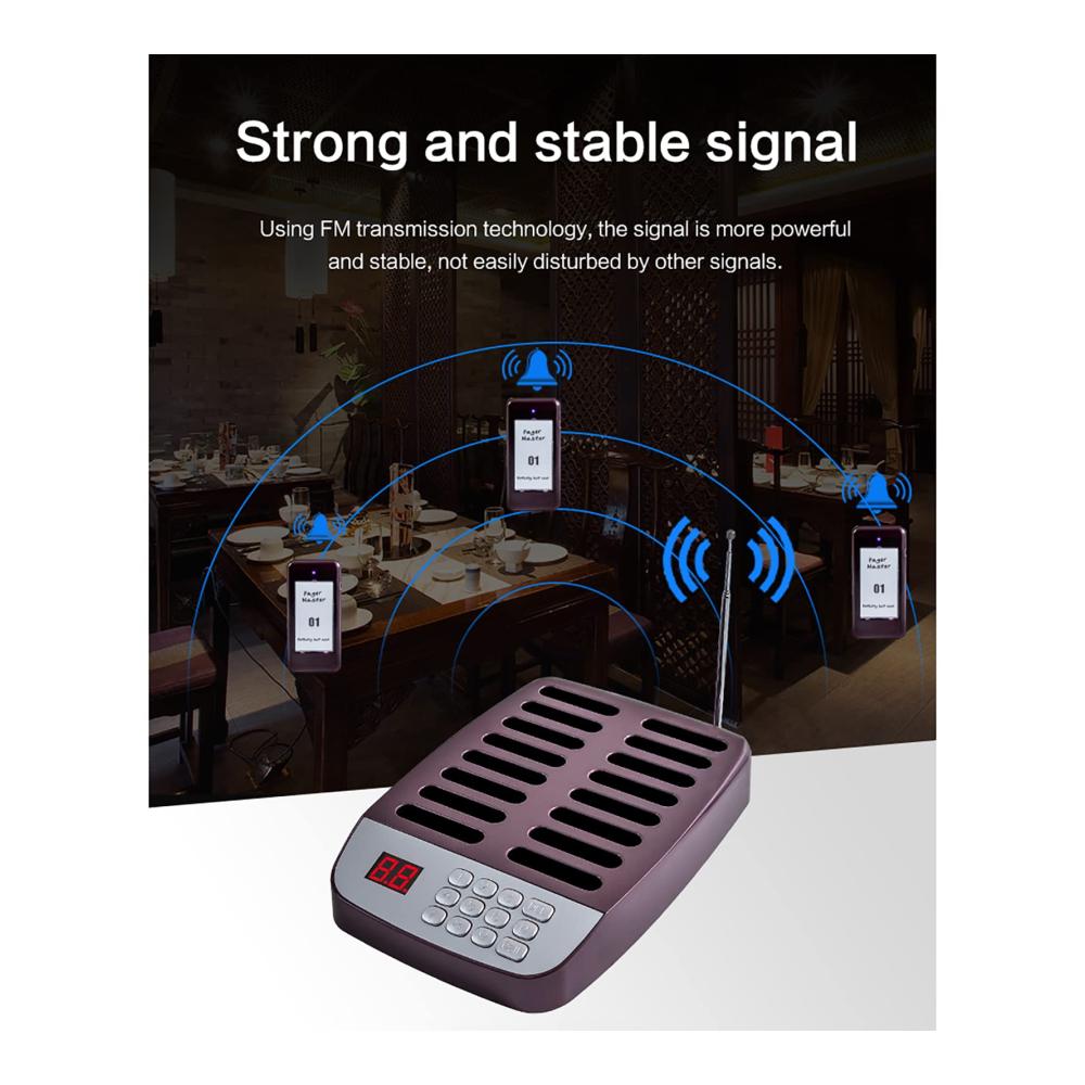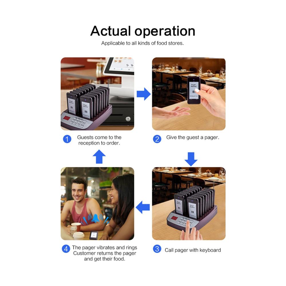 Restaurant-Pagersystem: Das drahtlose Pager-Rufsystem kann Menschenansammlungen reduzieren und die Arbeitseffizienz verbessern. Kunden können in ihren Autos oder in einem offenen Bereich auf ihre Bestellungen warten, und das Personal kann Kunden durch einfaches Drücken der Ruftaste darauf aufmerksam machen, dass ihre Bestellungen bereit sind