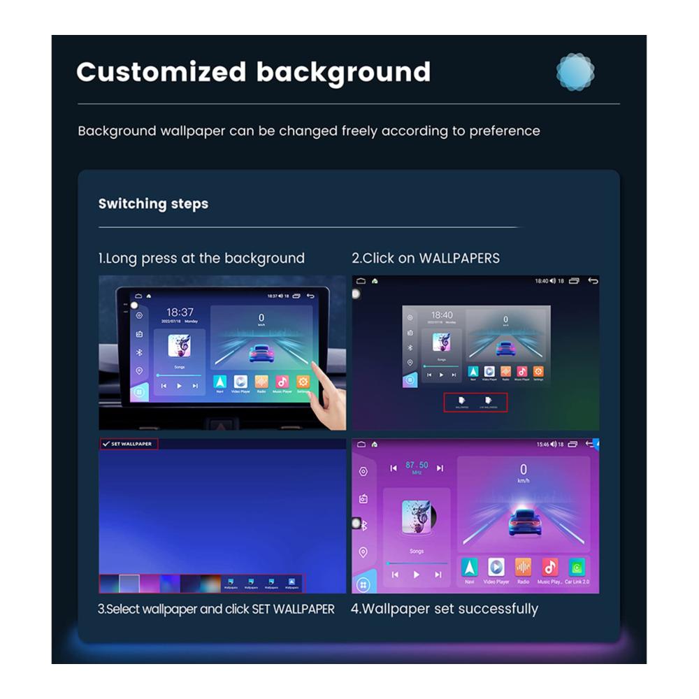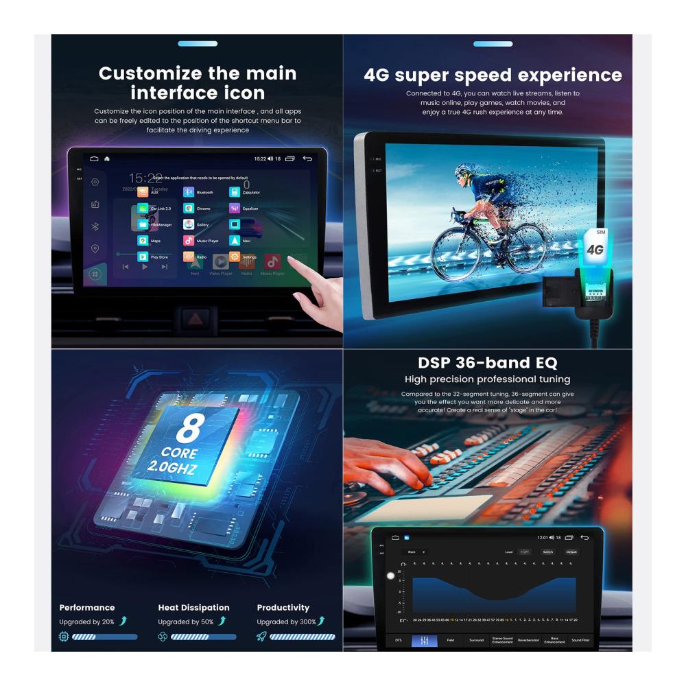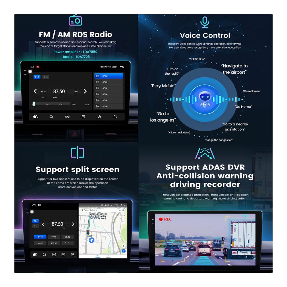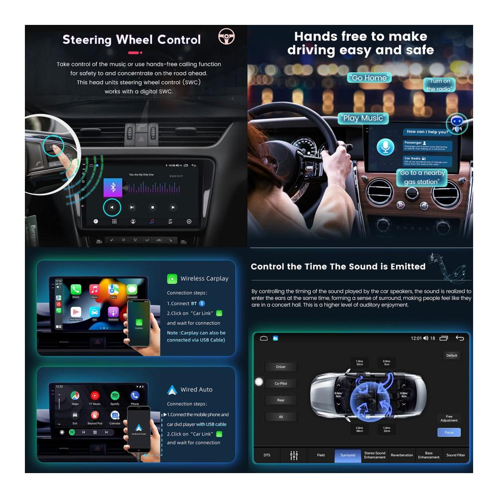 Genießen Sie erstklassigen Surround-Sound und nahtlose Konnektivität mit unserem Android 12 Multifunktions-Auto-GPS-Navigationssystem. Ausgestattet mit Qualcomm BT 5.1 für schnelle Übertragungsgeschwindigkeiten und stabile Anrufe. Das integrierte DSP 36EQ-Modul bietet verlustfreien Surround-Sound, während DTS 4.1/5.1-Kanal-Surround-Systeme ein immersives Klangerlebnis bieten. Mit kabellosem Carplay und Android Auto bleiben Sie konzentriert und verbunden. Die intelligente Sprachsteuerung und die Lenkradsteuerungsfunktionen sorgen für eine sichere und komfortable Fahrt. Erleben Sie Technologie auf höchstem Niveau mit unserem Armaturenbrett-Einbau-Videogerät.