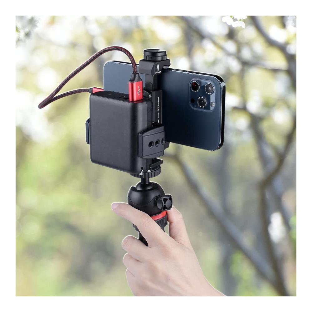 Mit mehreren 1/4-Zoll-20-Gewindebefestigungslöchern können Sie sie flexibel positionieren. Die Klemmbacken sind mit Gummi-Pads ausgekleidet, um Ihre Powerbank zu schützen. Mit nur 105 g trägt der Halter kaum zum Gewicht Ihres Setups bei.