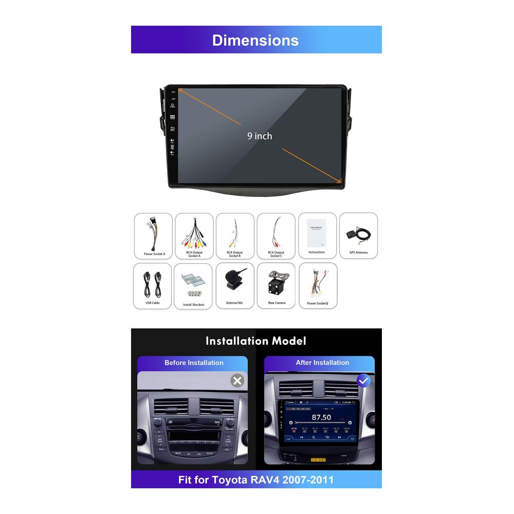 Das Auto-Navigation Android 12 Autoradio ist perfekt geeignet für Toyota RAV4 Modelle von 2007 bis 2011. Mit seinem 9-Zoll-Bildschirm und GPS-Navigation bietet es eine benutzerfreundliche und präzise Fahrzeugführung. Das 2-Din-Design trägt zur nahtlosen Integration in das Armaturenbrett Ihres Fahrzeugs bei.