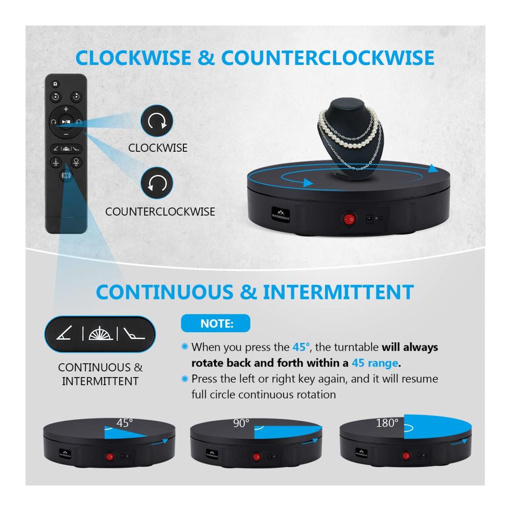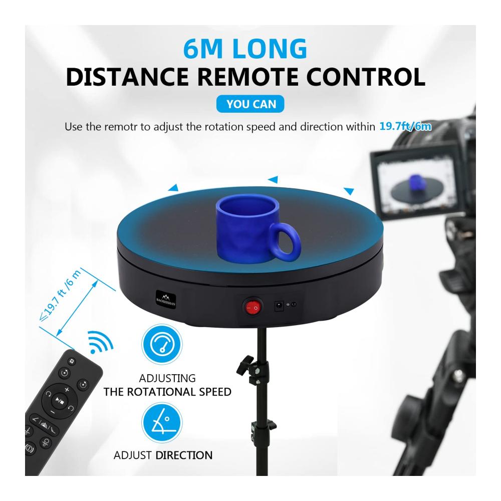 • [6M Fernbedienung] Der Drehteller kann in einem hindernisfreien Bereich von 6 Metern ferngesteuert werden. Einstellbare Geschwindigkeit, einstellbare Richtung, kontinuierliche oder intermittierende Rotation.