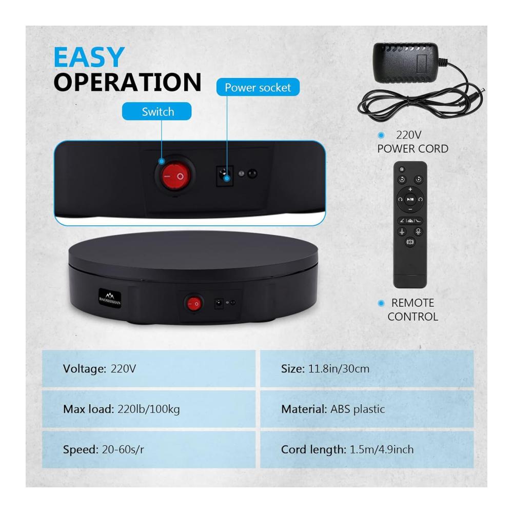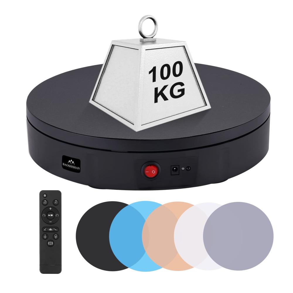 • Der BAOSHISHAN Elektrischer Drehteller mit einer Traglast von 100 kg und einem Durchmesser von 30 cm ist ideal für eine Vielzahl von Anwendungen geeignet. Aus hochwertigem ABS-Material gefertigt, sorgt der leistungsstarke Motor für eine reibungslose und geräuscharme Drehung. Die mitgelieferte Fernbedienung ermöglicht eine einfache Steuerung auf bis zu 6 Metern Entfernung. Perfekt für Panoramafotografie und Produktpräsentationen. Bitte beachten Sie die maximale Gewichts- und Größenbeschränkung für eine optimale Leistung. Erleben Sie Präzision und Komfort mit diesem elektrischen Drehteller.