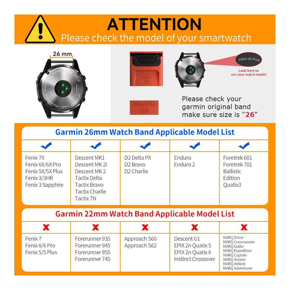【Kompatibles Modell 】Chinbersky 26mm Uhrenarmband Kompatibel mit Garmin Feinx 6X, Feinx 5X, Feinx 7X Fenix 5X Plus, Fenix 6X Pro, Fenix3,Fenix3 HR, Descent Mk1,Descent Mk2,Descent Mk2S,D2 Delta PX, Tactix Delta, Enduro, Enduro 2.NUR Uhrenarmband, NICHT im Lieferumfang enthalten Smart Watch.