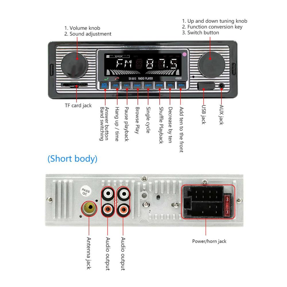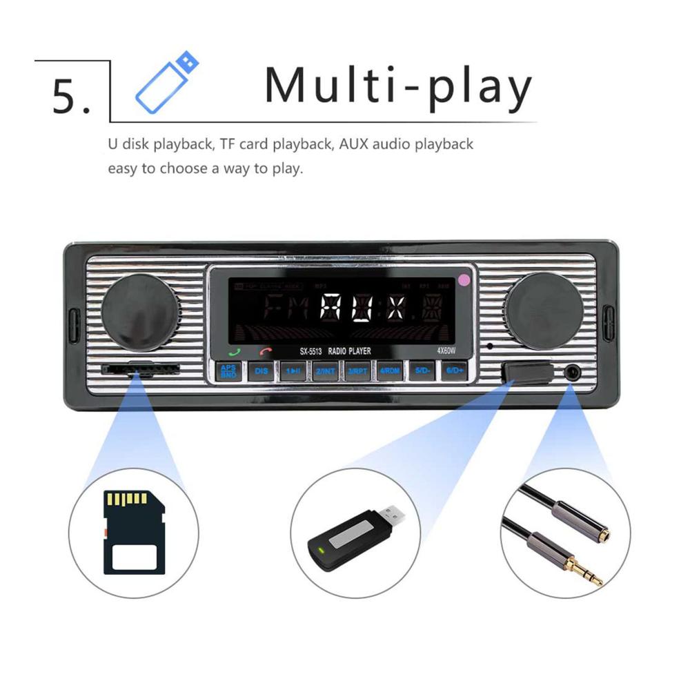 Spezifikation:Artikeltyp: AutoradioModell: SX 5513Spannung: 12 VTyp: On Board MP3Softwarelösung: 4900 Panel Beleuchtung: BlauRadioband: FMRadio Chip: QN8035Leistung: 55 WArbeitstemperatur: -10 ~ 60℃ Modell: Version 4.0Leistungsverstärker Chip: TDA7377Radiofrequenz: FM 87,5 ~ 108 MHzSpeicherkartensteckplatz: Großer Speicherkartensteckplatz. USB Schnittstelle und Version: USB 2.0 Schnittstelle. Schlüssel: Physischer SchlüsselRCA Anschluss: 4 WegeAusgang mit roter und weißer Buchse. Front AUX Audioeingang: JaUnterstützte Audioformate: MP3, WMA, WAV, FLAC. Grundfunktionen:1. FM Radio. 2. Lesen Sie die Audiodaten auf der Karte und dem USB Stick. 3. AUX Funktion. 4.Funktion. 5. DerAudioausgang kann an einen Subwoofer angeschlossen werden. Batterietyp: 2 x AAA Batterie für Fernbedienung, nicht im Lieferumfang enthalten. Paketliste:1 x Autoradio2 x Netzkabel1 x Fernbedienung2 x Metallentfernerstück1 x BenutzerhandbuchAnwendung:Plug and Play.
