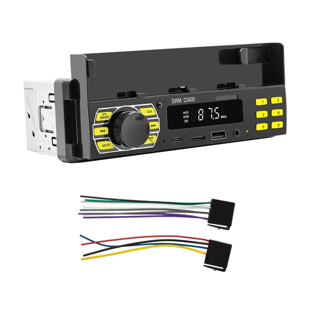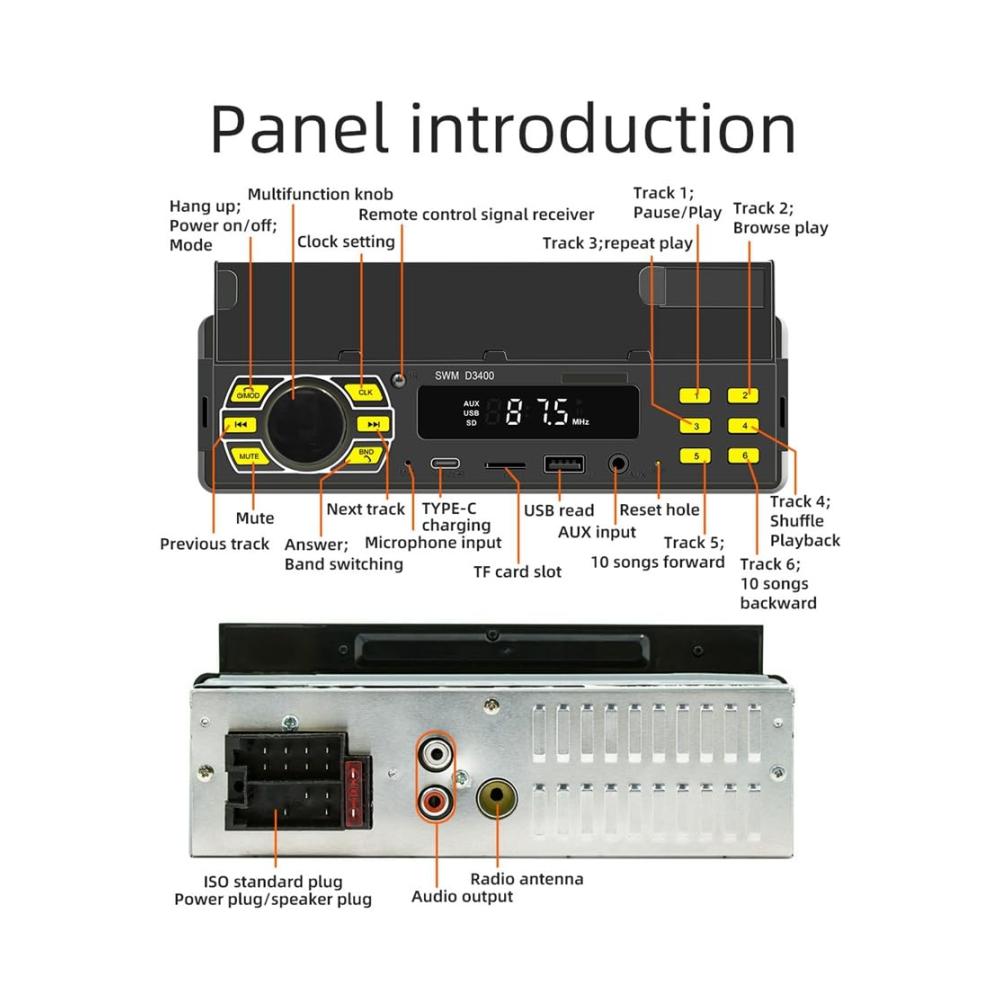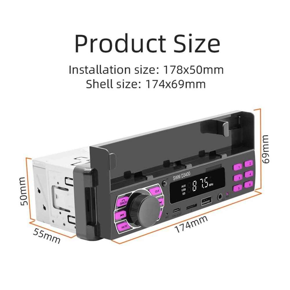GYSURYB Modell: D3400Radioband: FM1, FM2, FM3Radiofrequenz: FM 87,5M-108Mhz (europäische Standardfrequenz)Bluetooth-Version: Version 5.0 (Standardname: CAR BT)Einbaugröße: 178x50mmWiedergabemodus: USB-Laufwerk, AUX, Bluetooth, KartenwiedergabeArbeitstemperatur: -10~60 ℃Arbeitsspannung: 12-14,4 VAusgangsleistung: 45Wx4Audioformat: MP3/WMA/WAV/FLAC/APEFarbe: schwarzMaterial: ABSPaketinhalt:1x Autoradio2x NetzkabelNur der oben genannte Paketinhalt, andere Produkte sind nicht enthalten.Hinweis: Wegen der Lichtreflexion und Bildschirme könnte der Farbeton in den Fotos sowie des tatsächlichen Produkts etwas unterschiedlich sein. Der erlaubte Messfehler ist /- 1-3 cm.