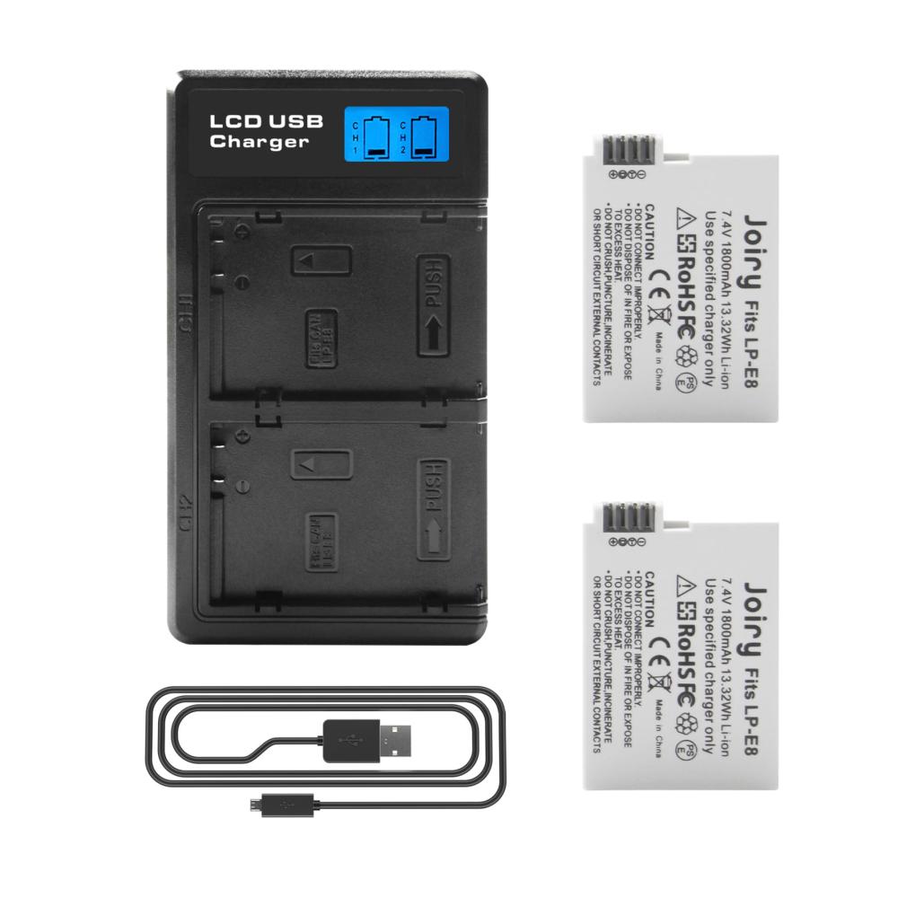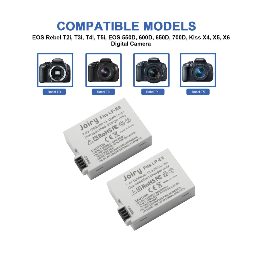 Erhalten Sie mit dem Joiry LP-E8 Ersatz-Akku und Dual-LCD-Ladegerät ein leistungsstarkes Set für Ihre Canon Rebel T2i, T3i, T4i, T5i, EOS 550D, 600D, 650D, 700D, Kiss X4, X5, X6 Digitalkamera. Jedes Paket enthält 2 Lithium-Ionen-Batterien mit einer Kapazität von 1800mAh und einer Spannung von 7,4V. Kompatibel mit Canon LP-E8 und einfach zu verwenden dank des mitgelieferten Dual-Ladegeräts und Micro-USB-Kabels.