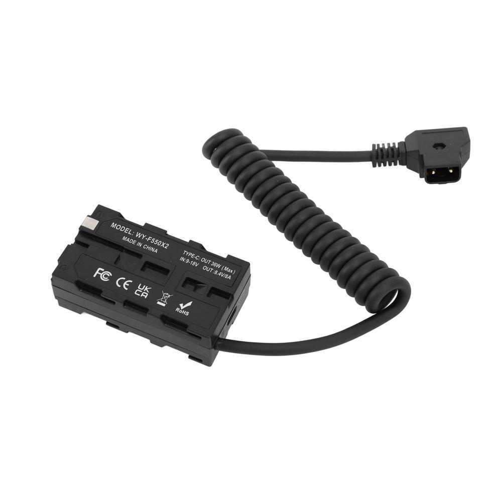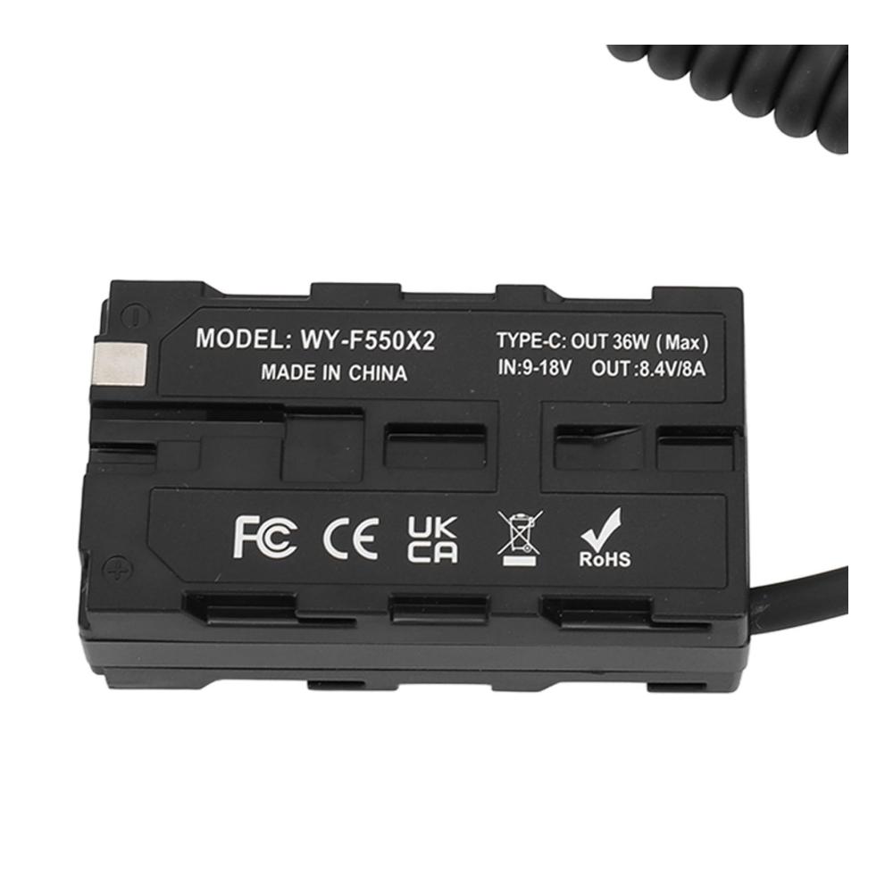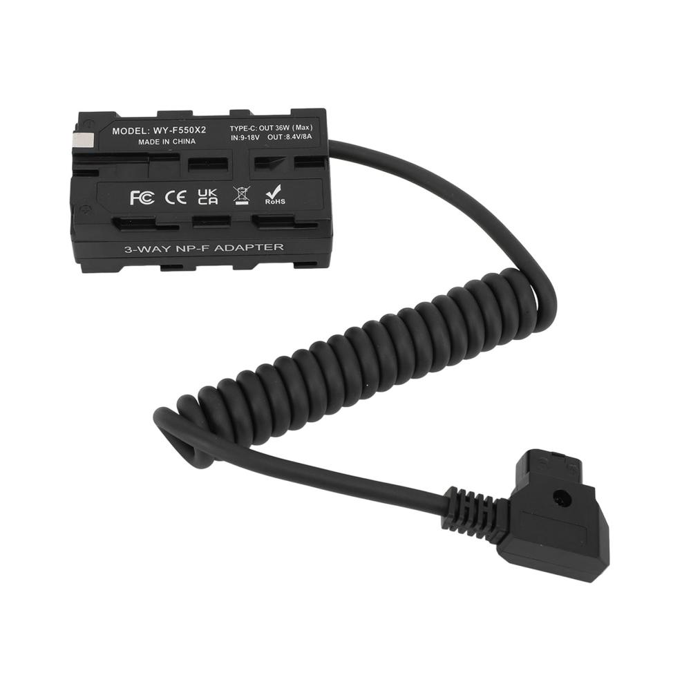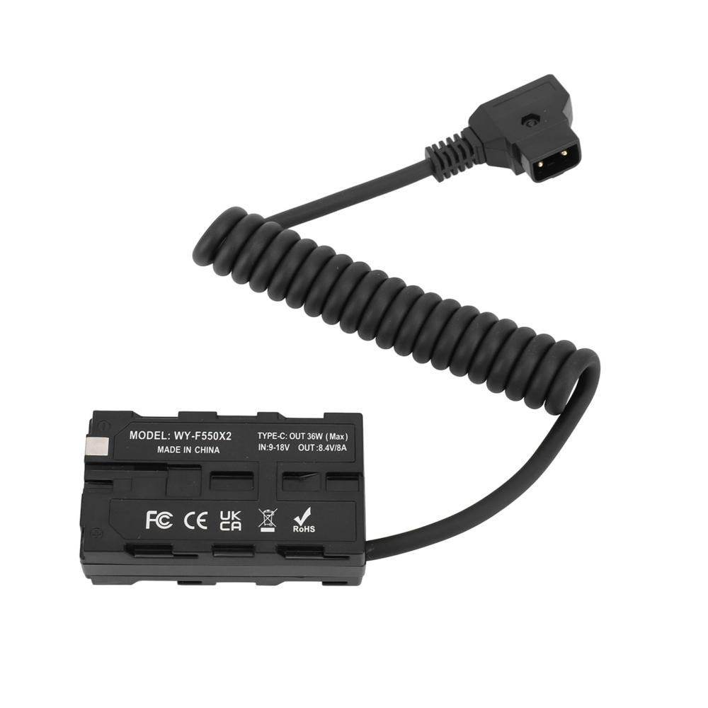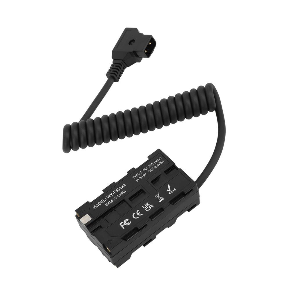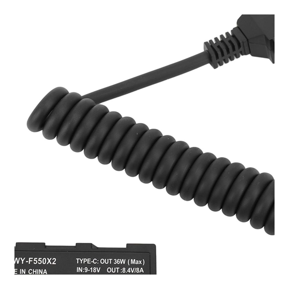 DREIFACHER AUSGANG: Mit der doppelseitigen F550-Schnittstelle und dem Typ-C-Ausgang ist der Dummy-Akku mit einem spiralförmigen Netzkabel ausgestattet, das den Abstand zwischen den meisten Geräten berücksichtigt.